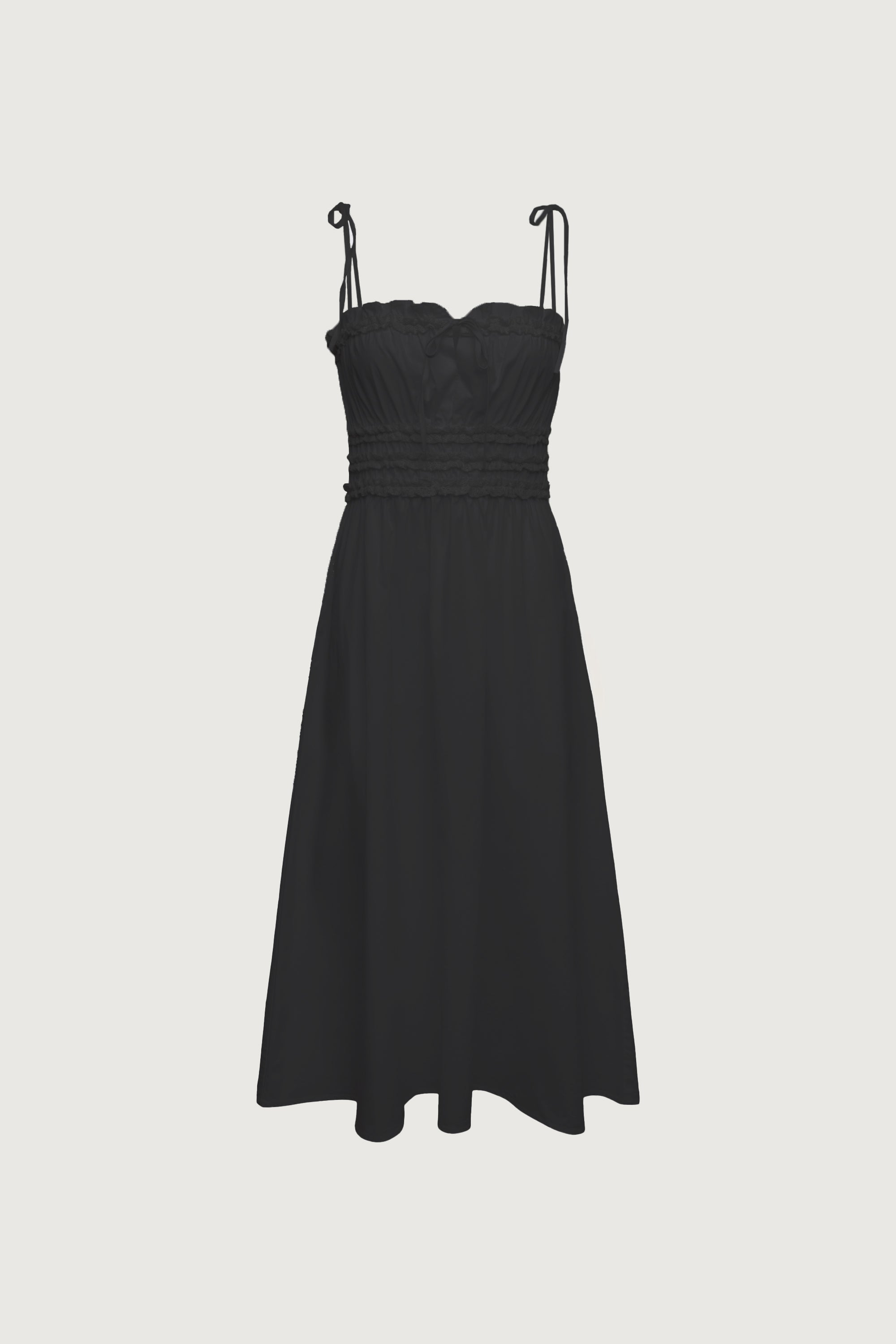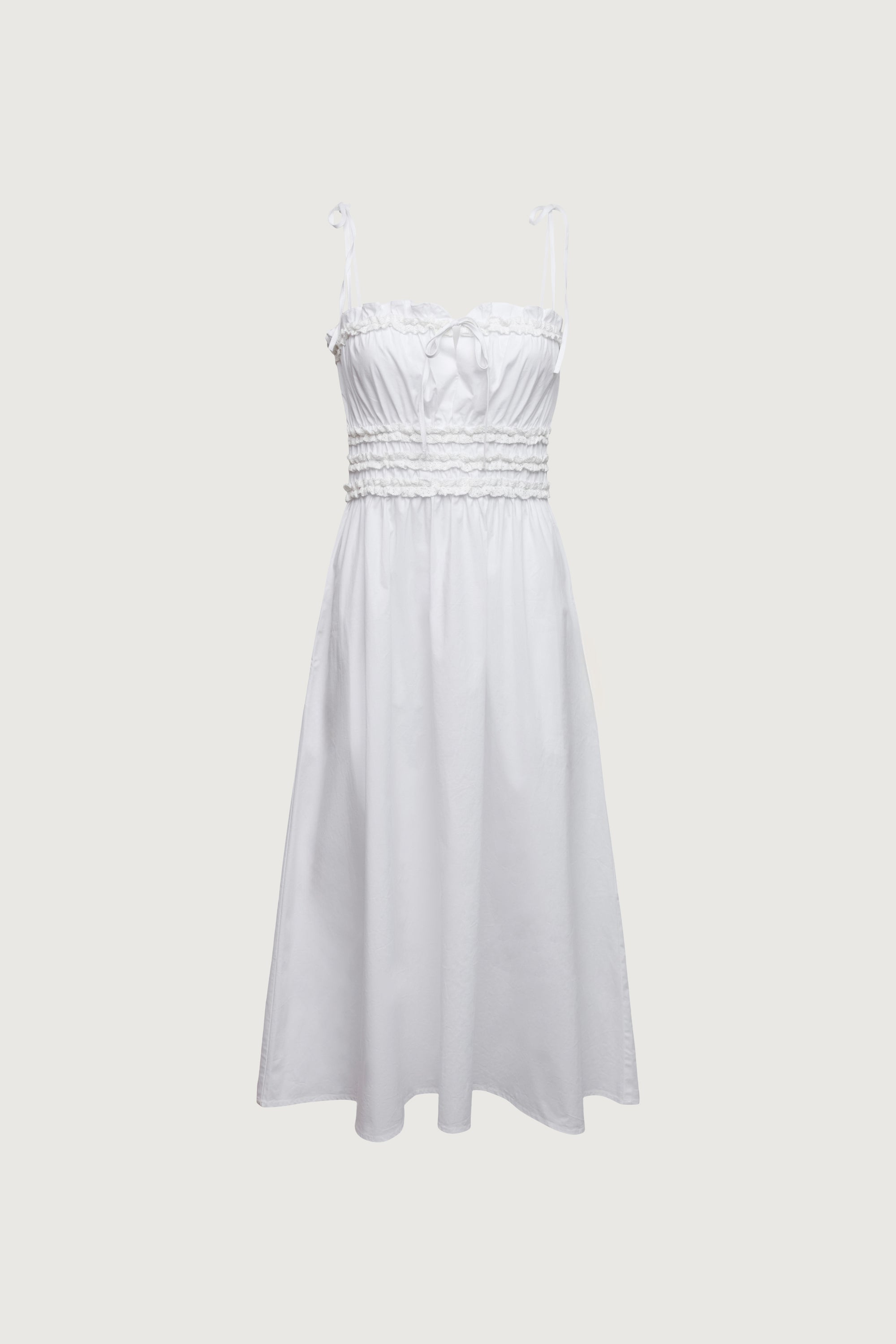 This cotton poplin midi dress will be your new go-to this season. It's has a shirred bodice with crochet lace details, self tie shoulder straps and a gathered waist. The best of part of this dress is its pockets. Pair yours with mesh ballet flats.