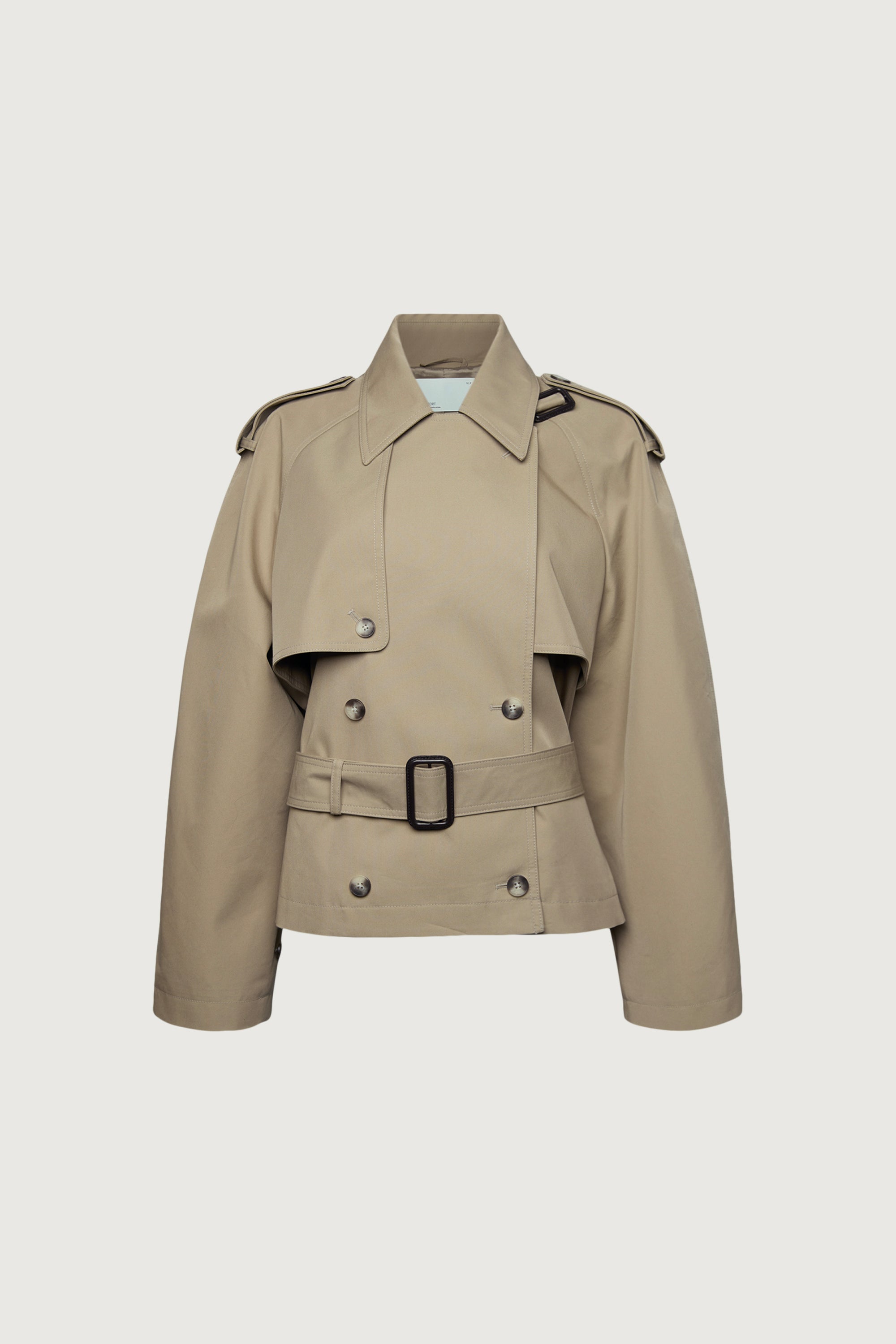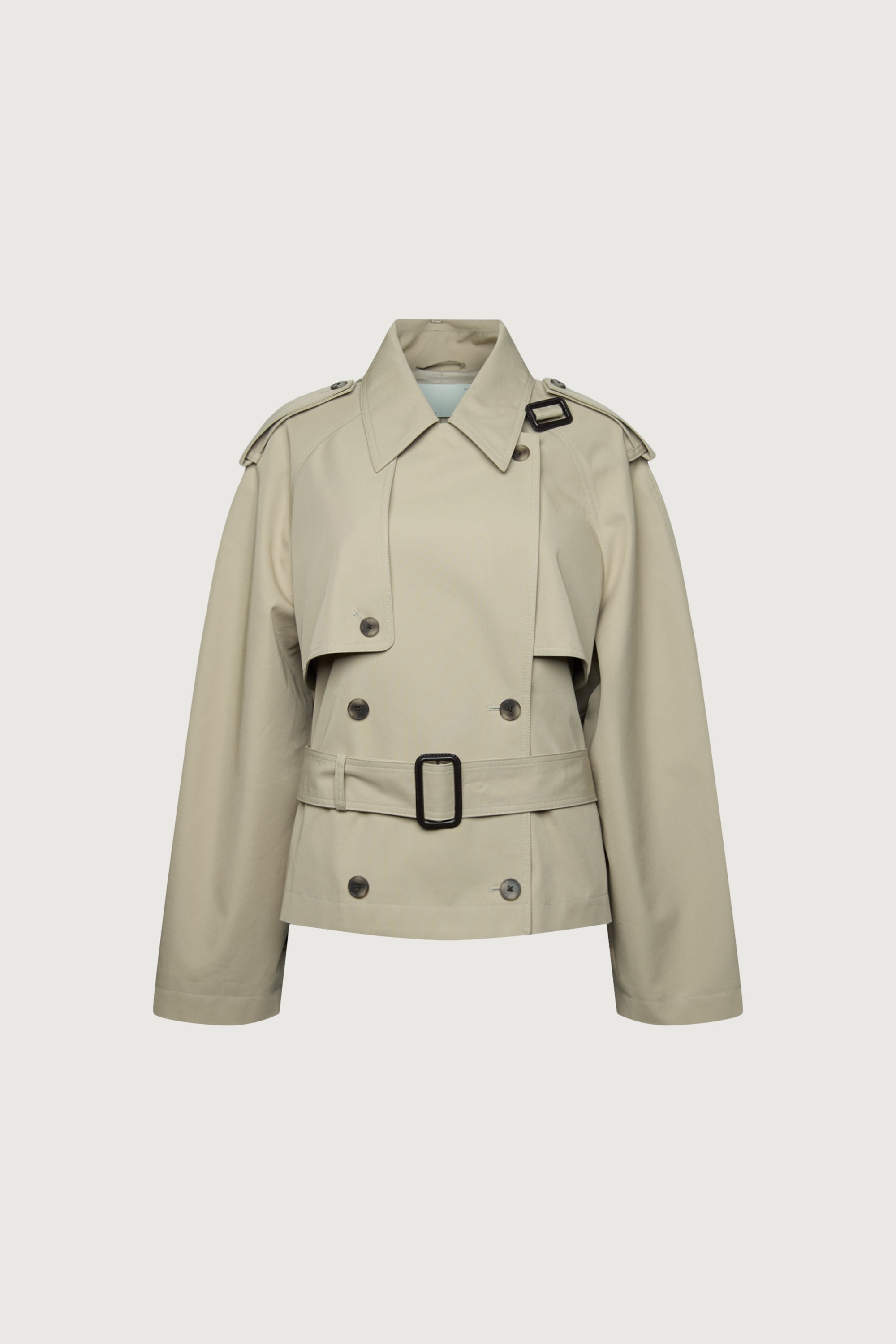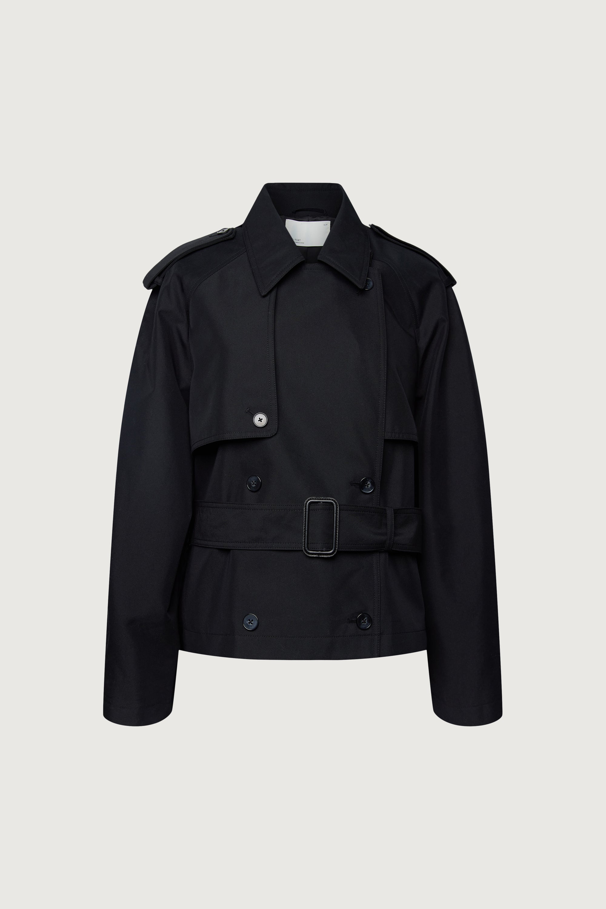 This water resistant, cotton twill trench coat is made in an oversized fit with a tailored silhouette. It's made in a short length to keep things simple and it features the classics—epaulettes, a double-breasted front and a belt at the waist. It's updated with a collar that can be worn as a funnel neck and is detailed with a removable buckle strap. It's now available in Black, Light Kelp and Beige.