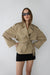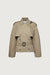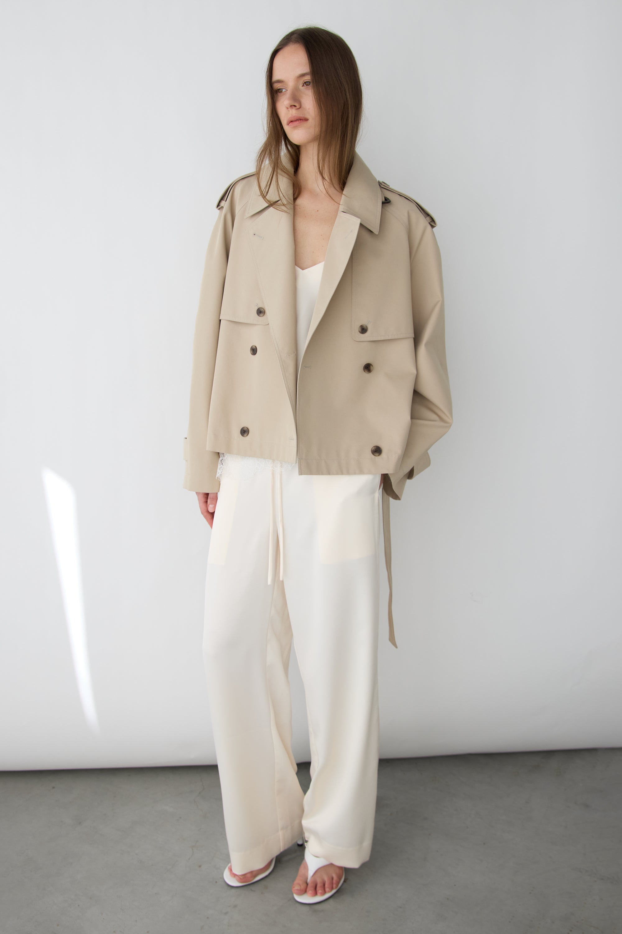 Cotton blend with water resistant coating. Collar with belt detail. Epaulettes. Storm flap. Double-breasted front. Belted waist. Button sleeve details.