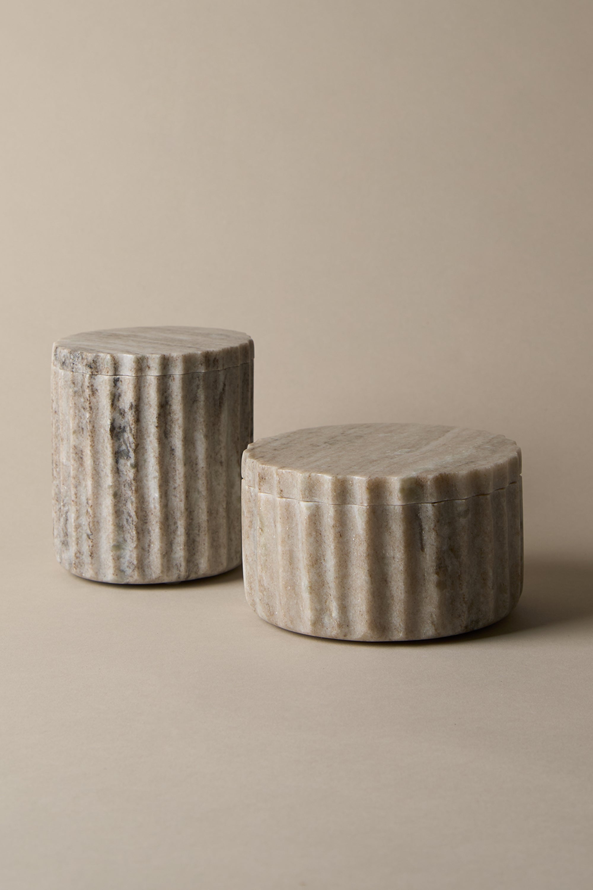 Crafted from solid marble, the Short Marble Canister showcases expert hand carving and intricate fluting detail, making it a striking addition to any home. The refined design pairs beautifully with the natural veining of the marble, ensuring that each piece is completely unique. Due to the inherent variations in marble, no two canisters are alike, making this a truly one-of-a-kind storage solution. Whether used to organize or as a decorative statement piece, the Short Marble Canister brings a sophisticated, timeless touch to your space. Complete your set with the Tall Marble Canister DE-13831-H.