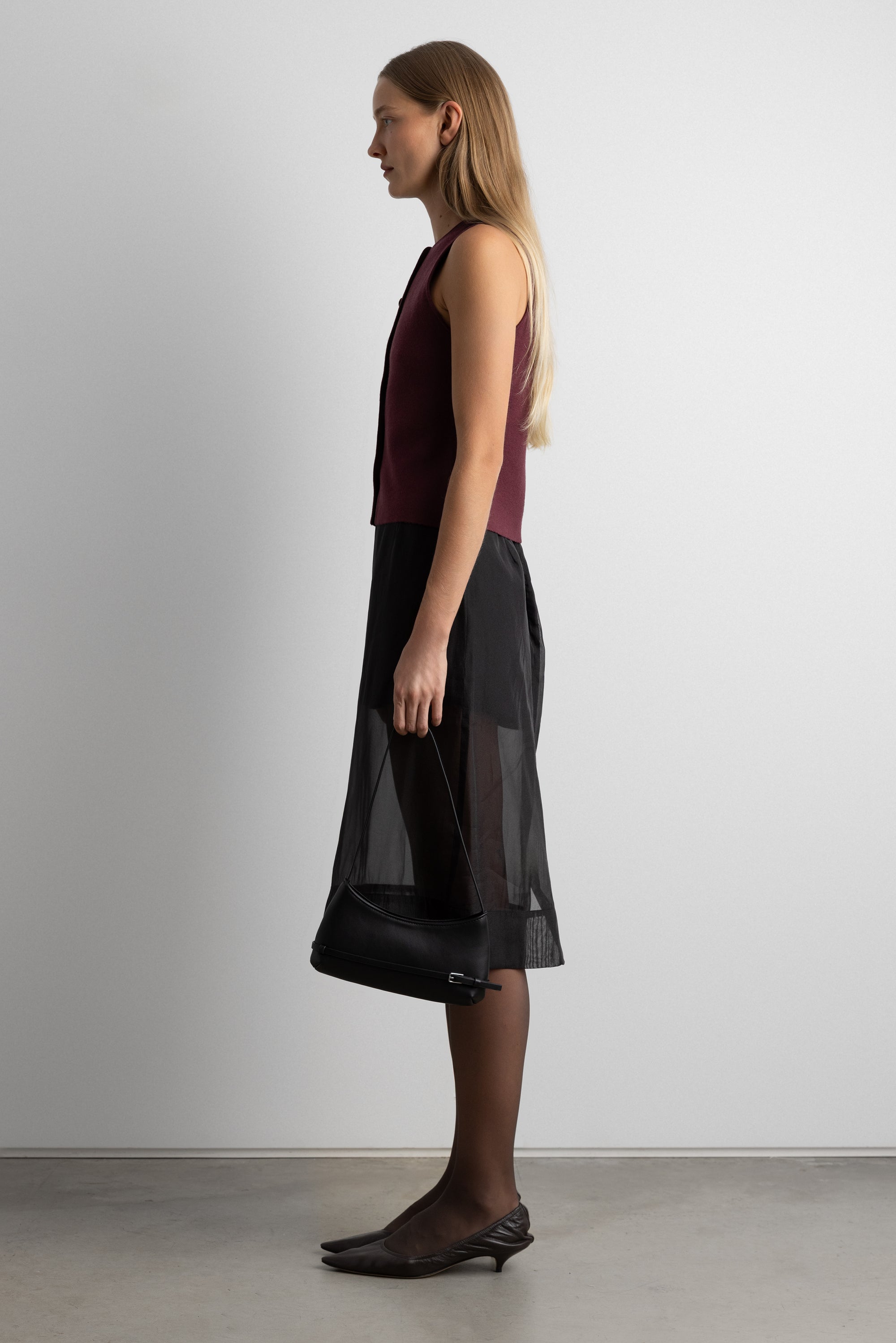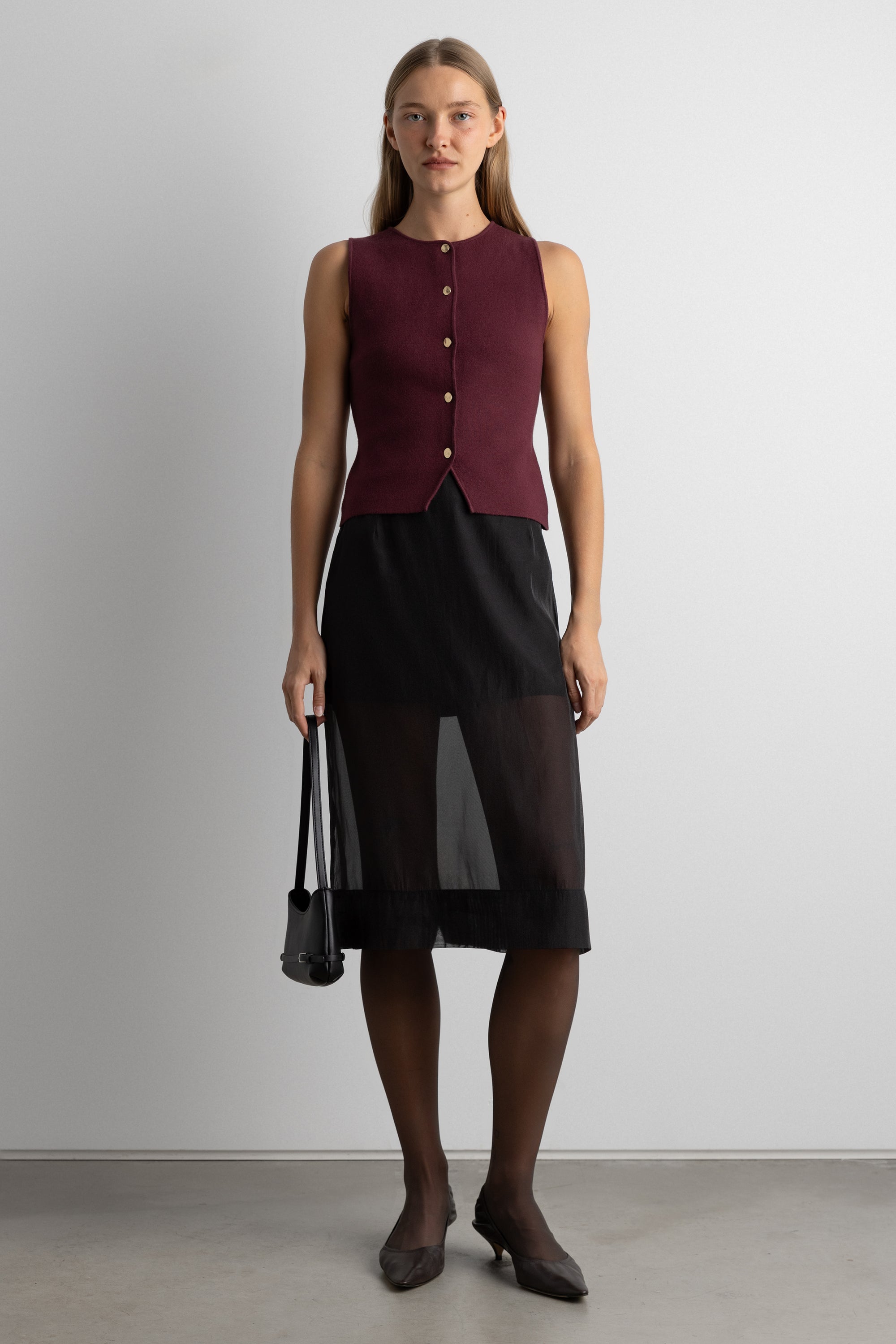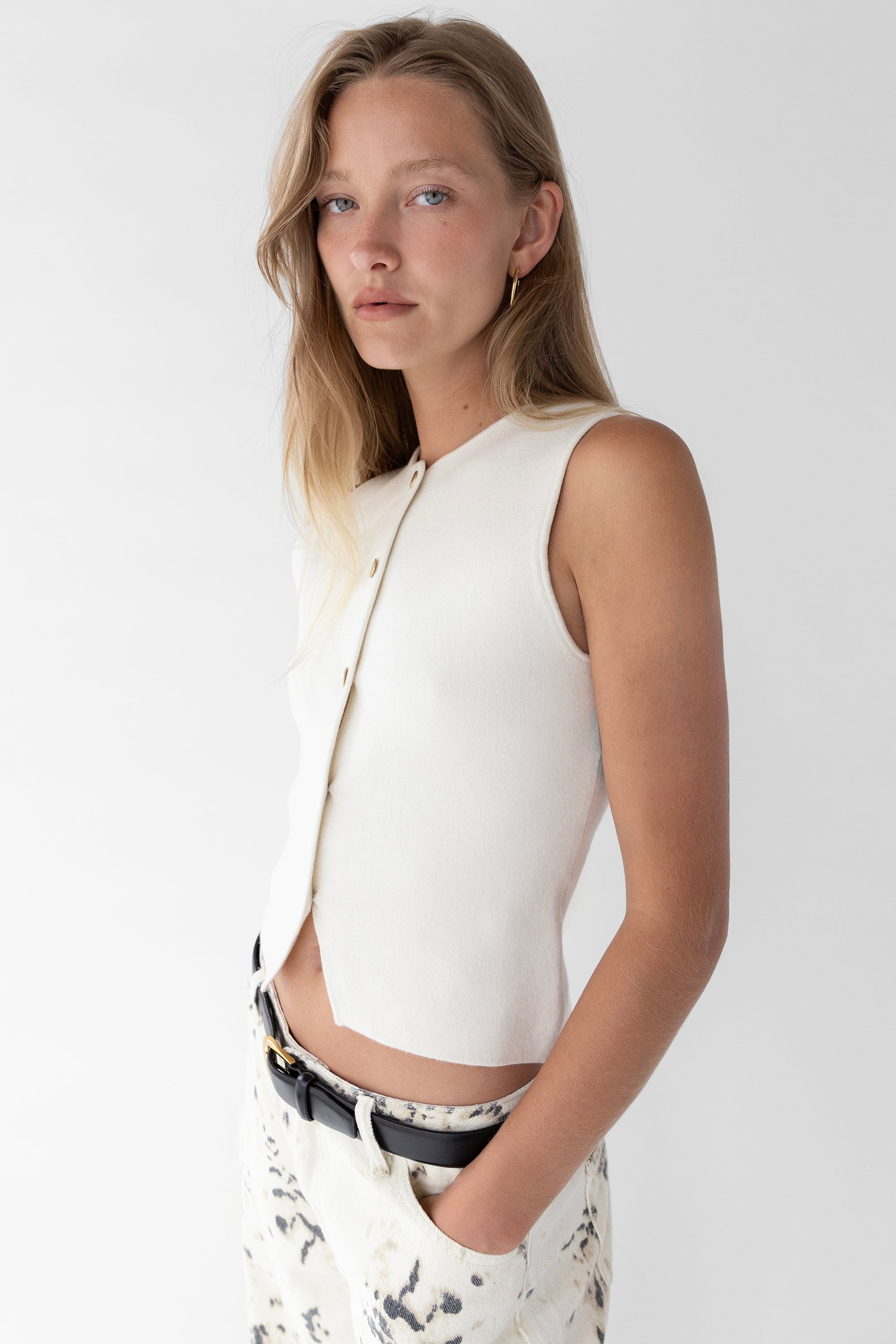 This sleeveless sweater vest is made in a slim fit and is detailed with gold hammered front buttons for an effortless elevated touch. A versatile transitional piece you can wear alone with trousers or with a satin midi skirt.