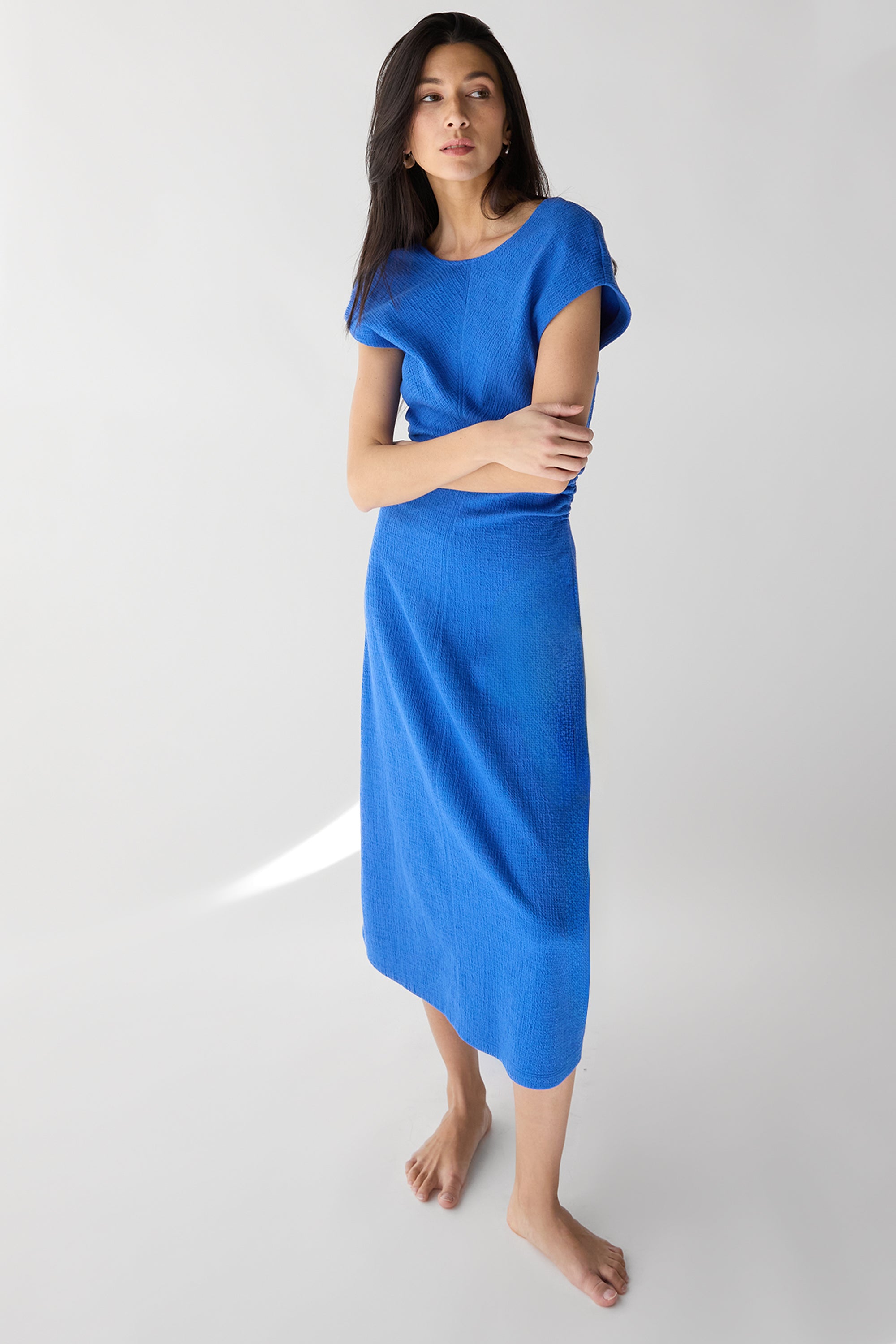 This sleeveless midi dress is cut from a cotton blend jacquard knit in a slim fit. It's detailed with a V-back and ruched details at the waist to highlight the subtle A-line skirt. A versatile silhouette you can dress up with heels and bold jewelry or style it casually with flats and sunglasses.