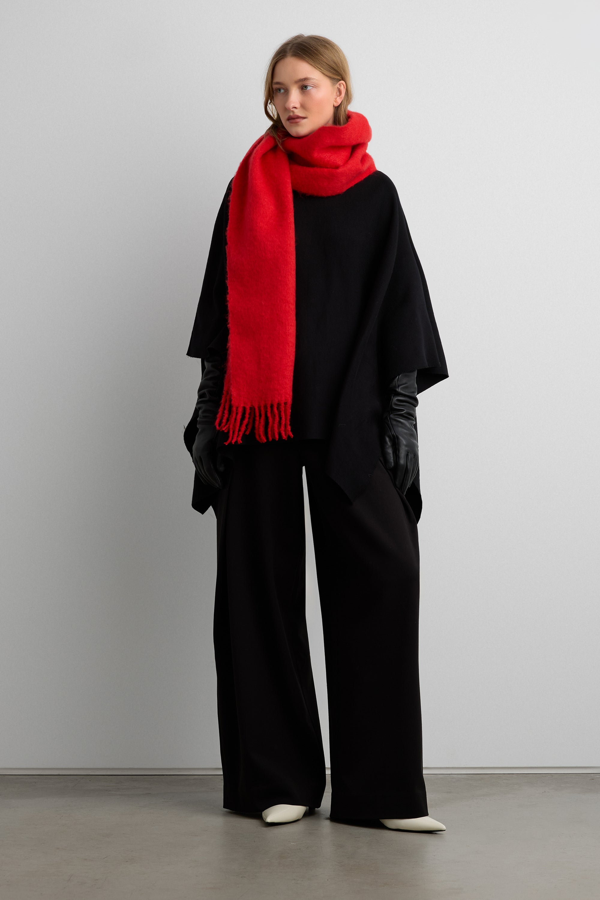 This solid red colour scarf has fringe details. Wear yours as a pop of colour this fall and winter season.