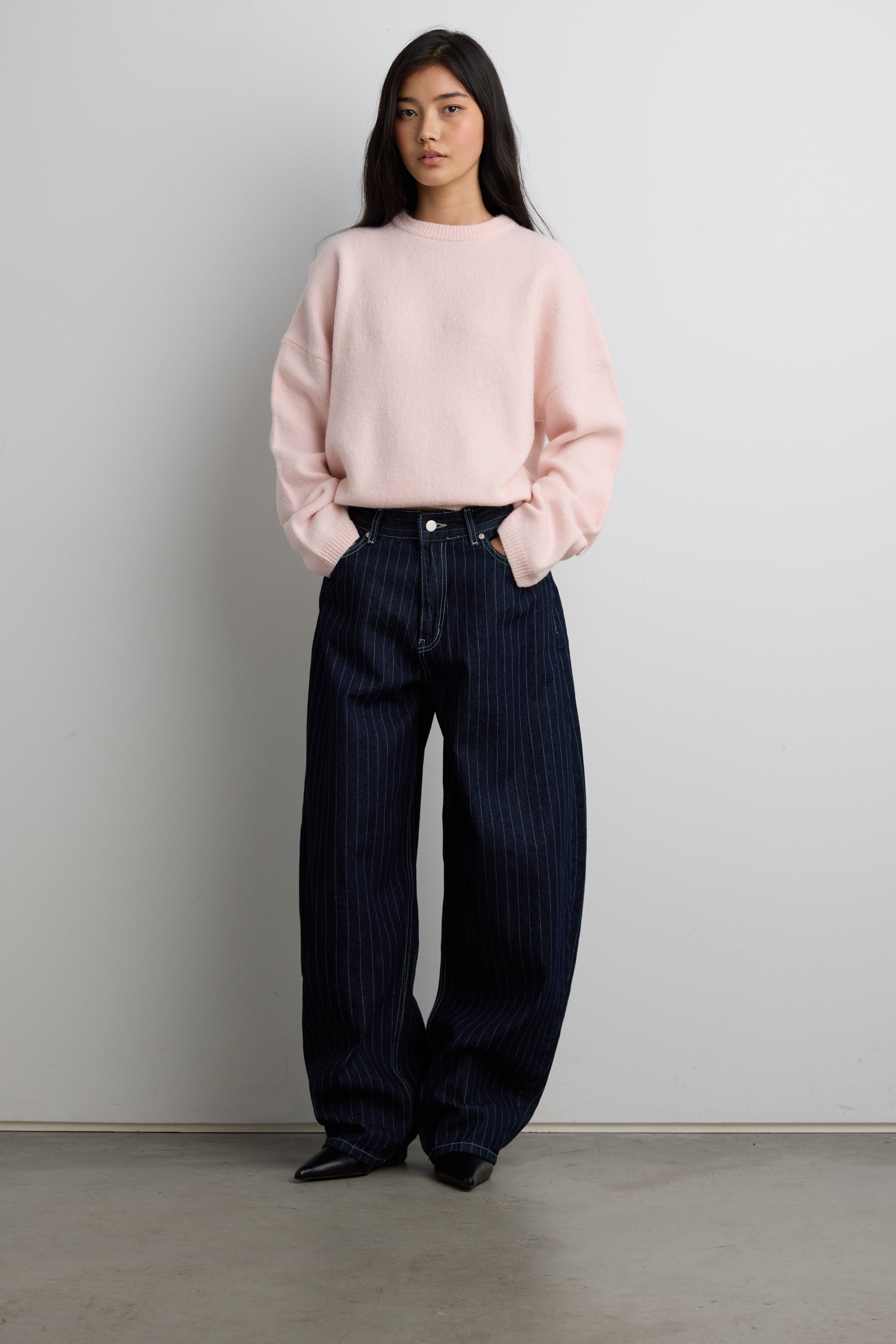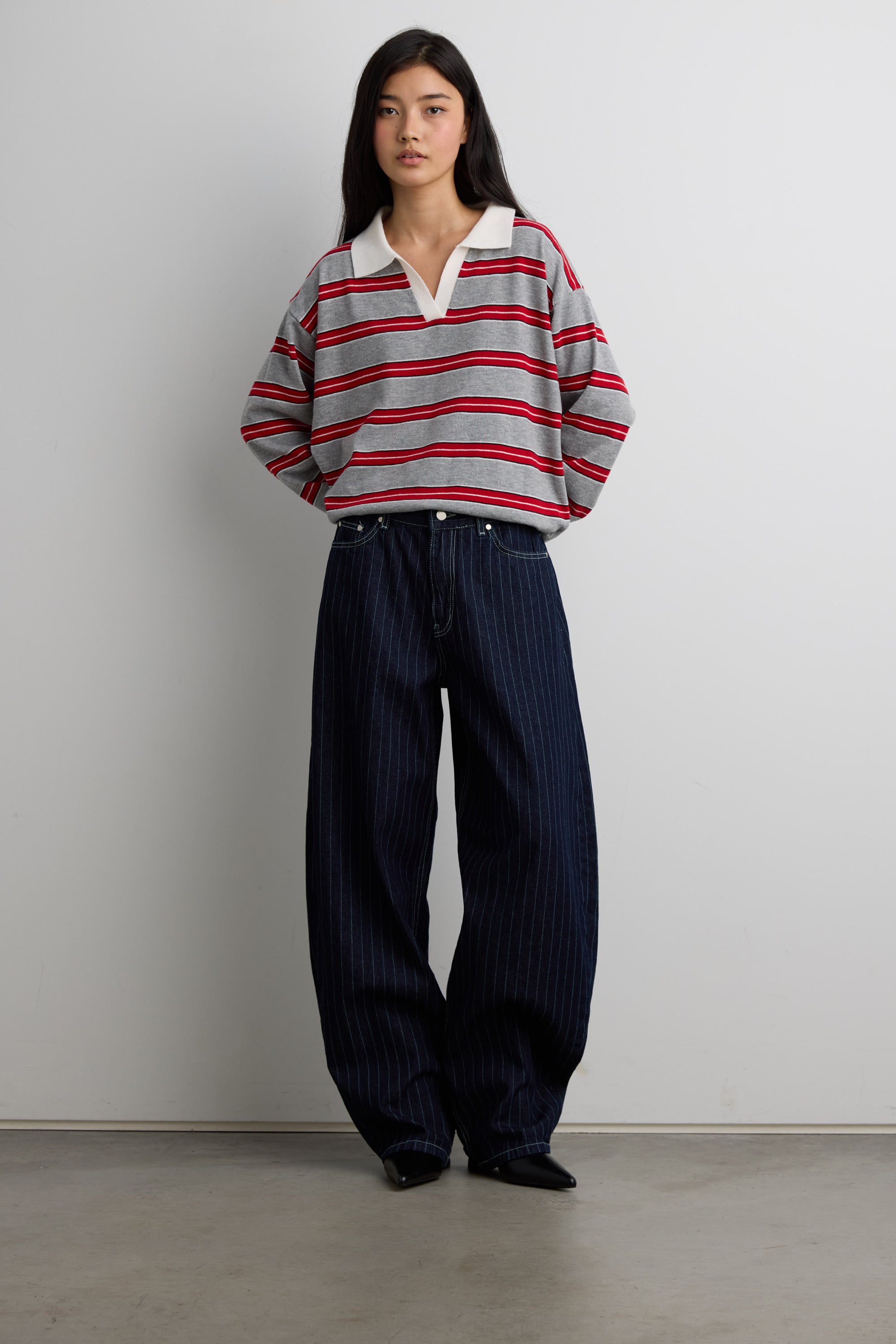 These jeans feature a deep indigo wash with a pinstripe design and contrast stitching . The barrel leg cut offers an elevated laid-back look, while the classic 5-pocket design, button fastener, and zip fly ensure functionality and a comfortable, secure fit. Perfect for everyday wear, these jeans combine comfort and clean modern day style.