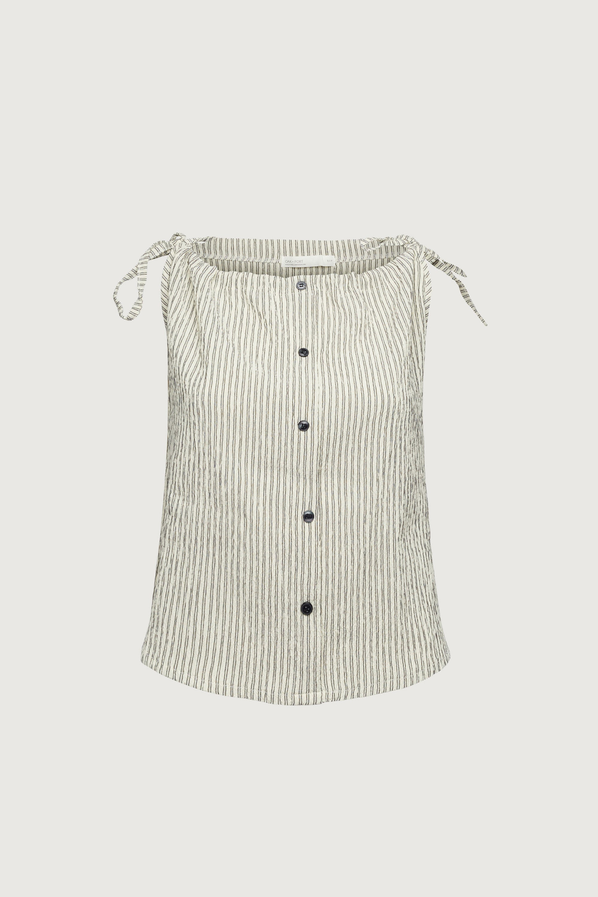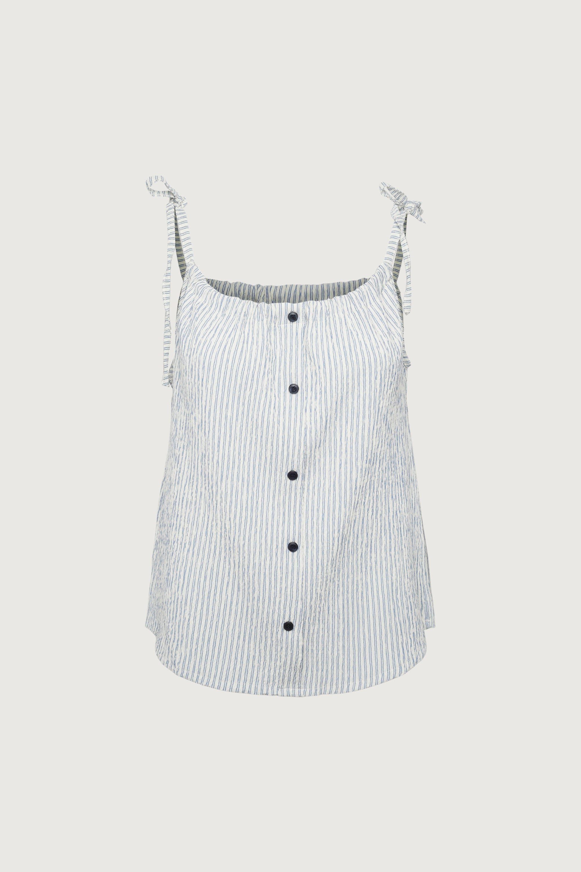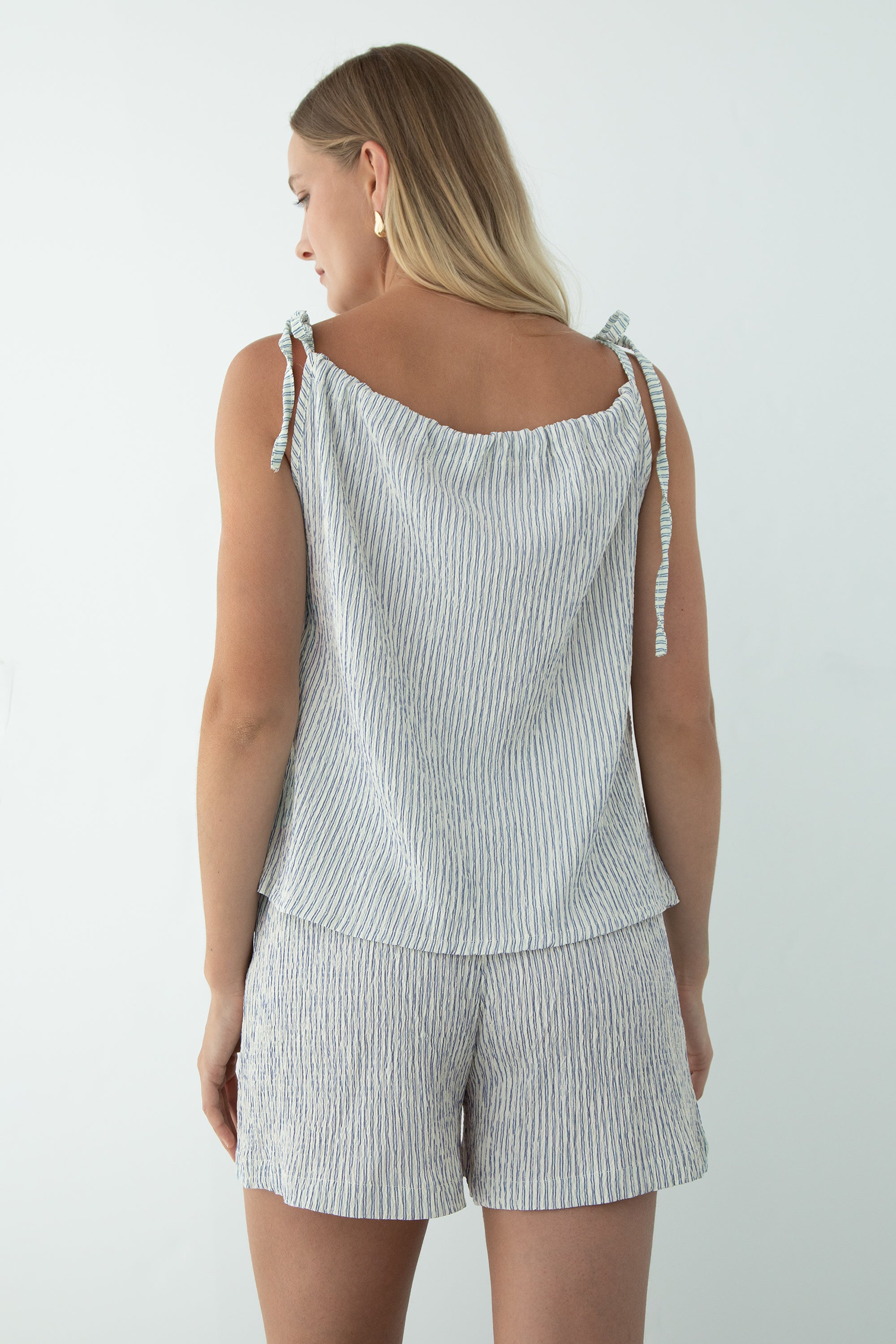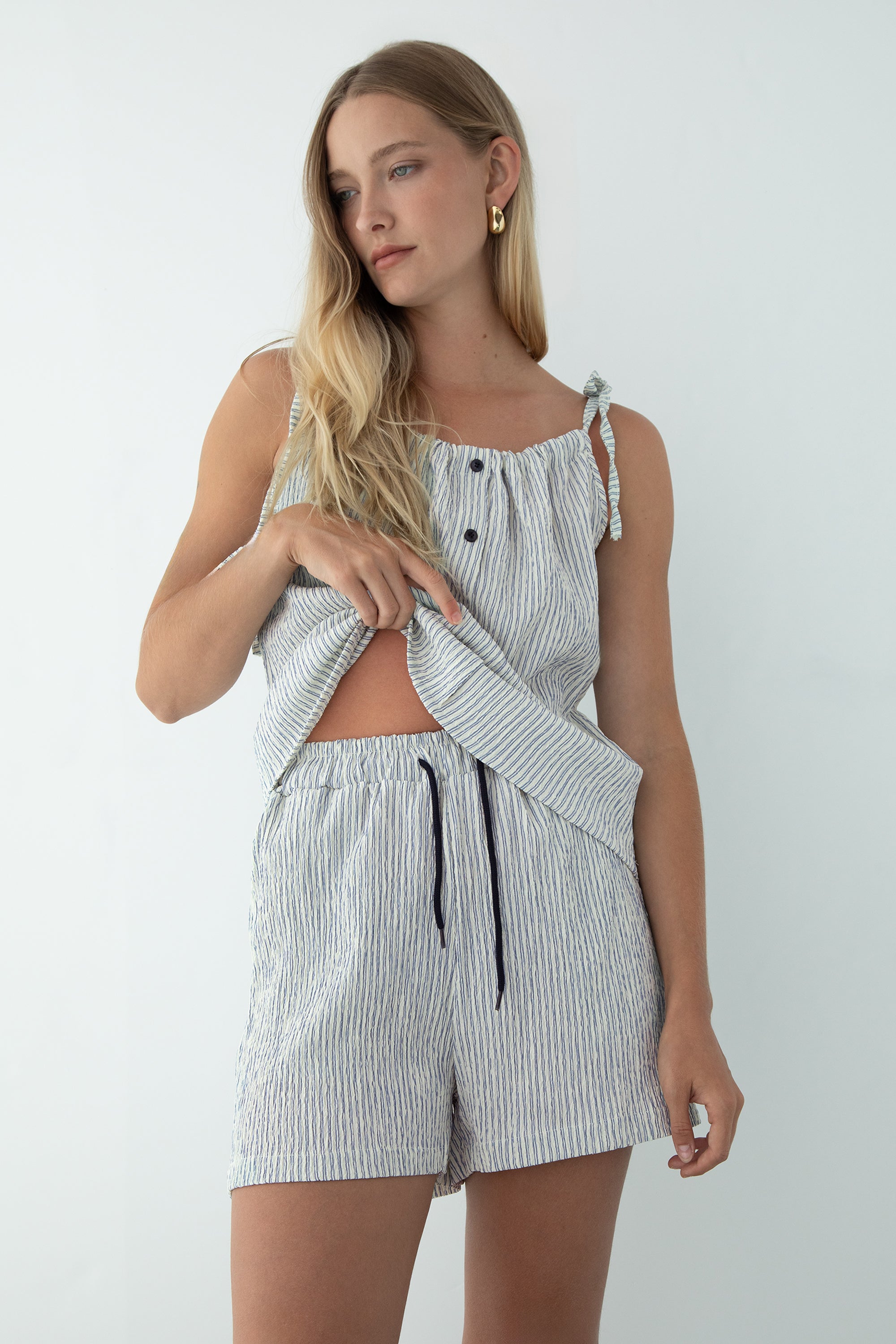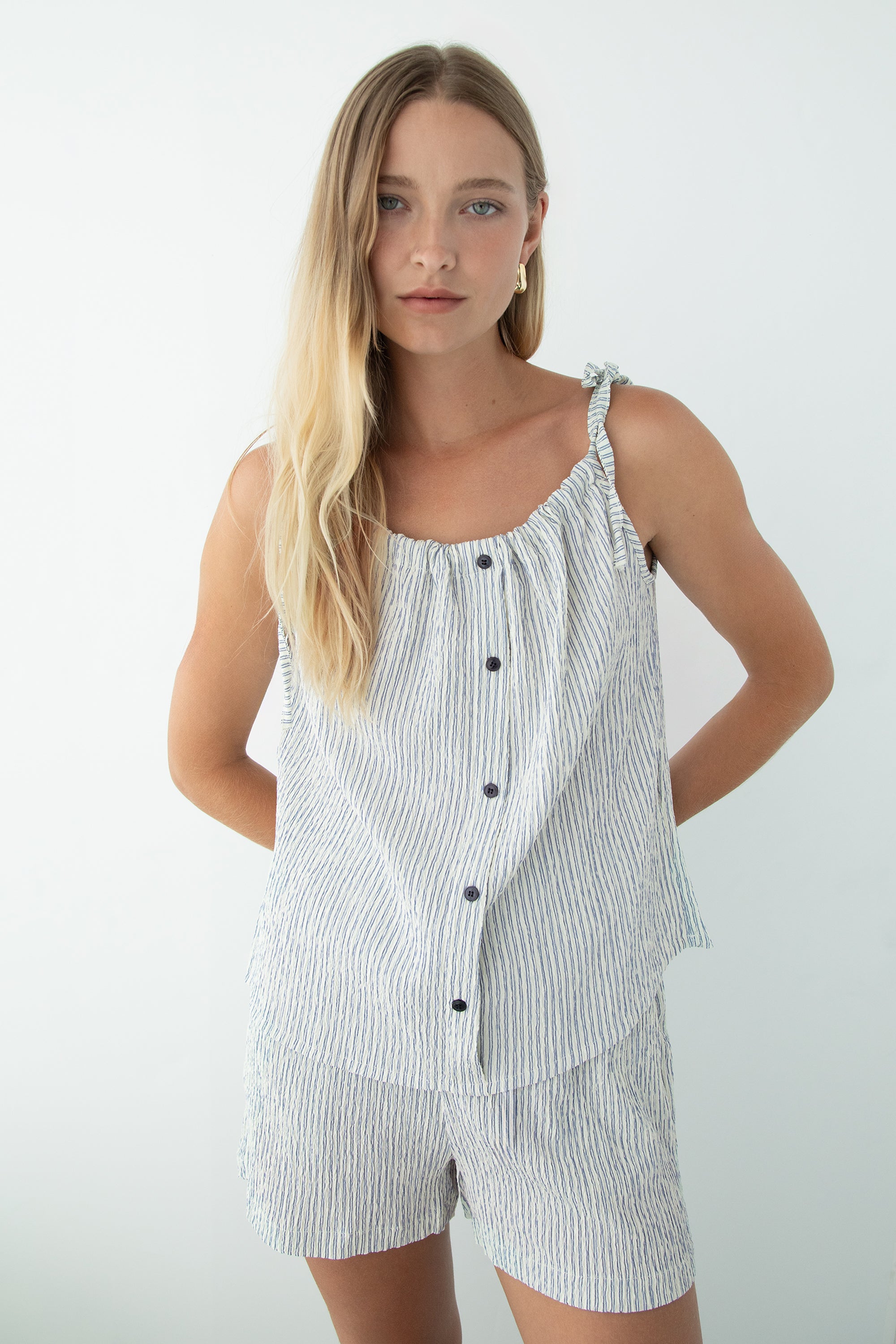 Set. Tank top. Shoulder ties. Buttons. Drawstring waist. Stripe pattern.