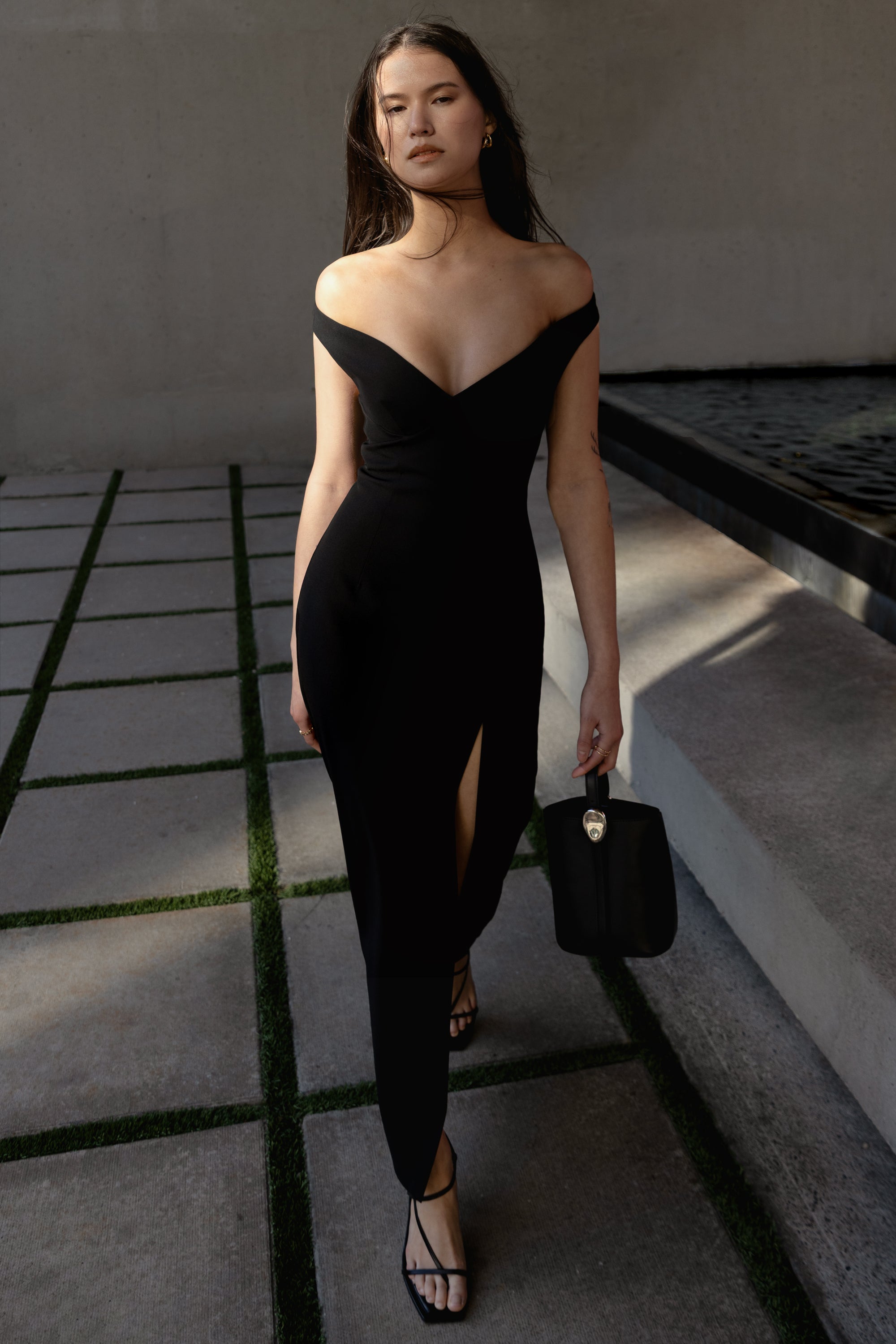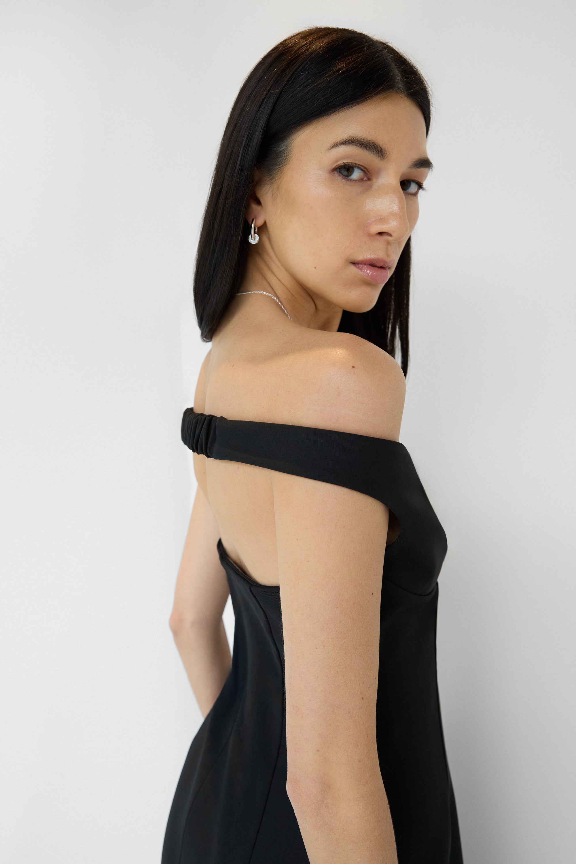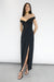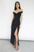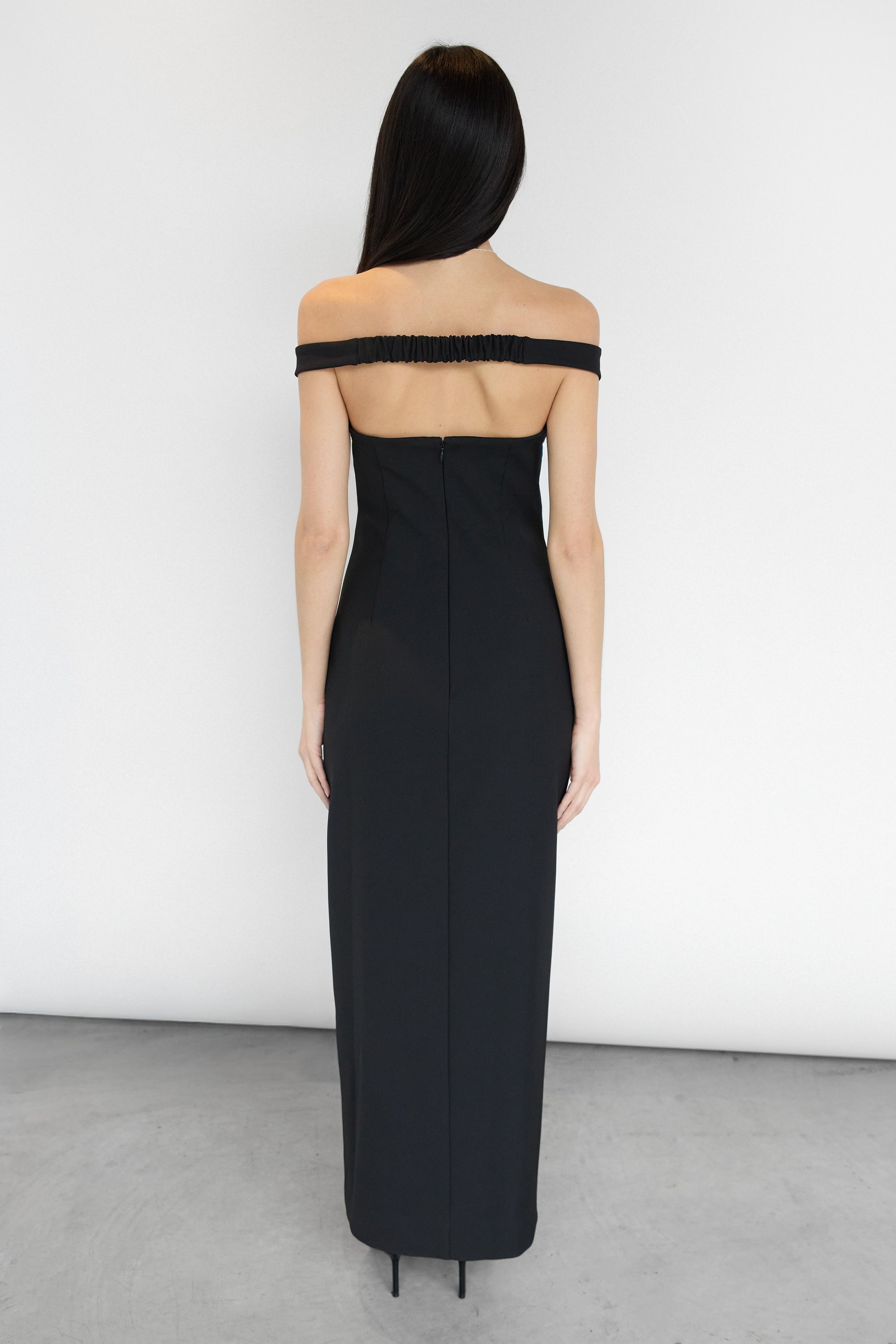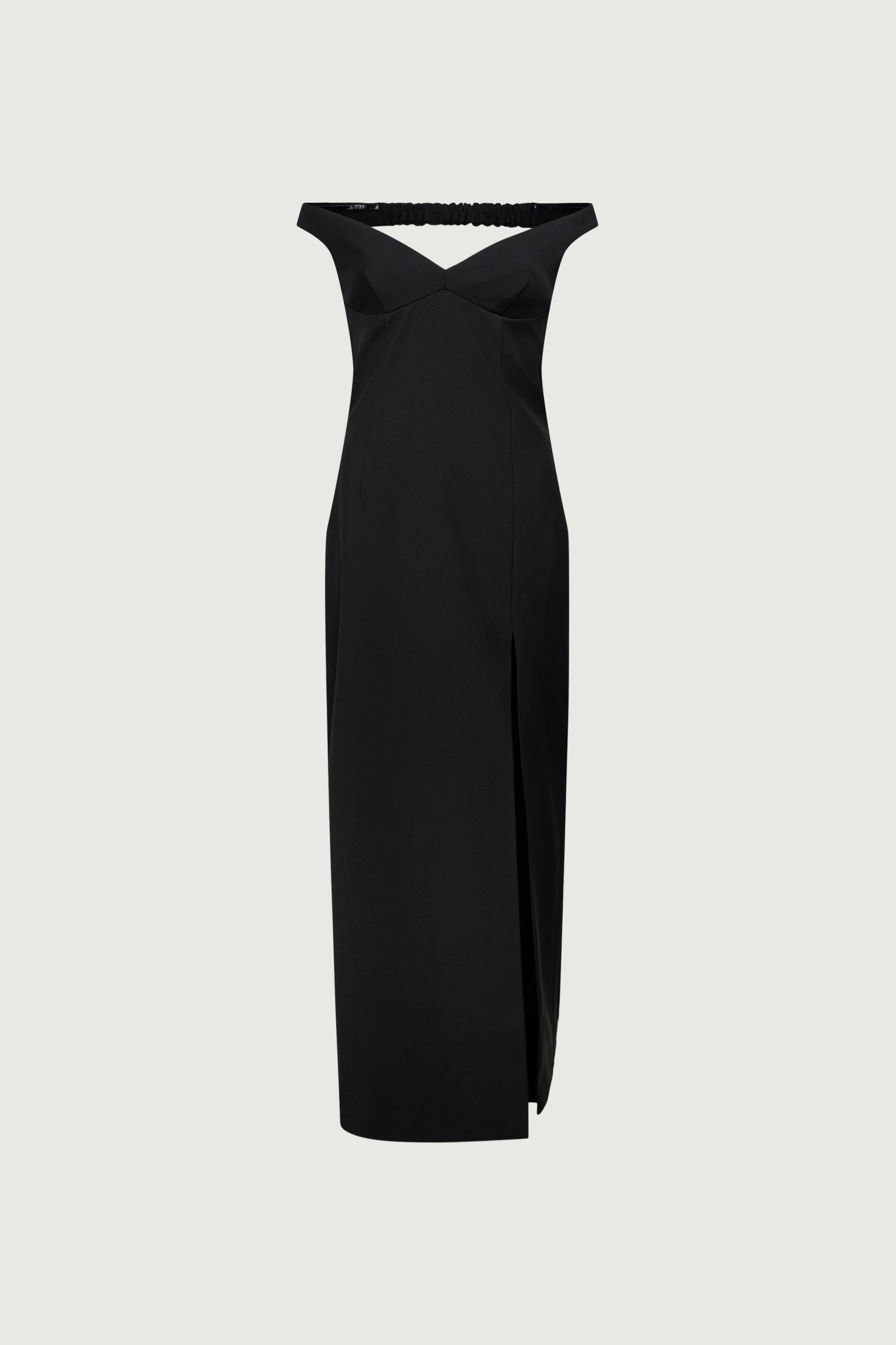 Twill suiting fabric. Sweetheart off the shoulder neckline. Elasticated back with open back design. High slit. Back darts and zipper closure.