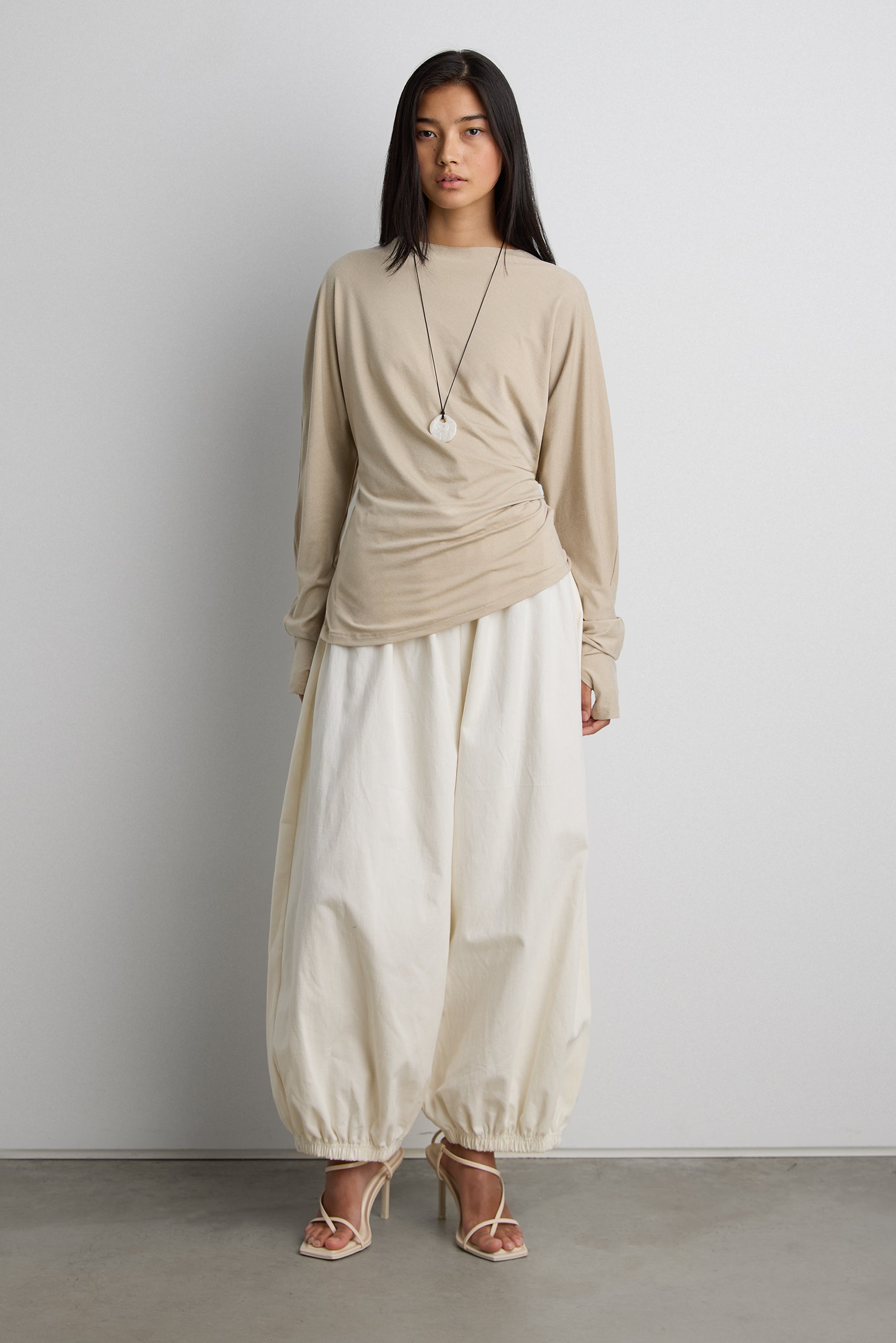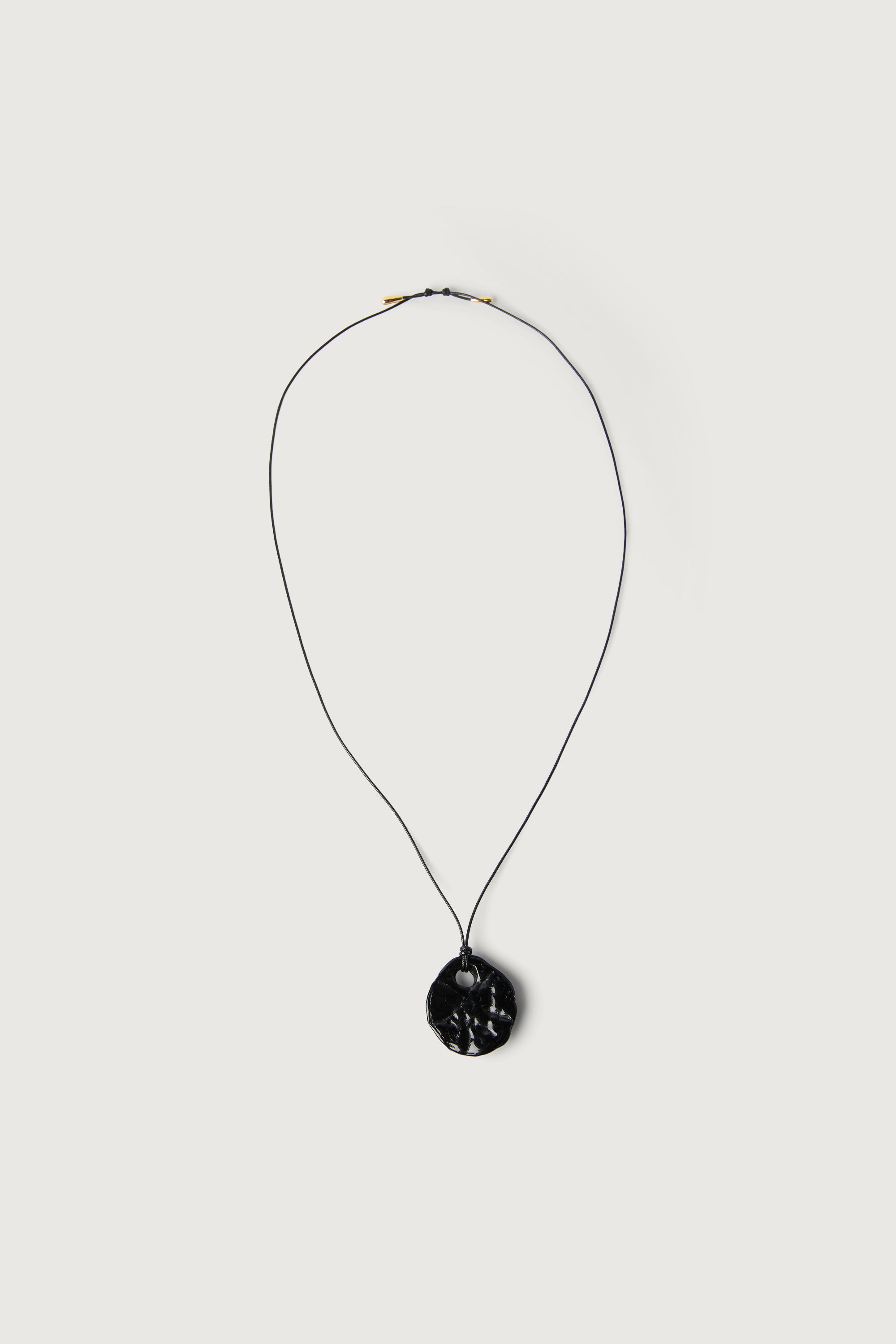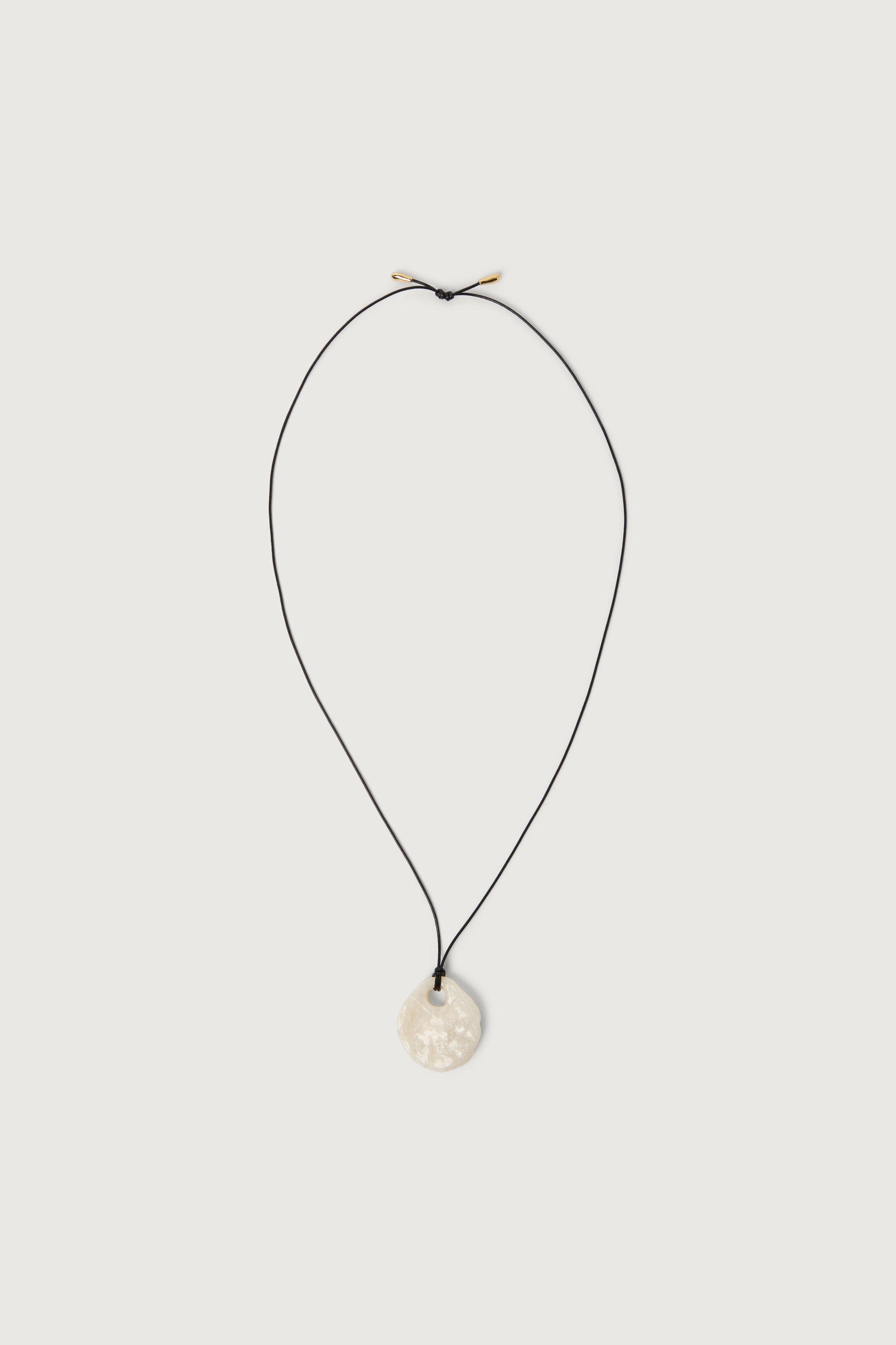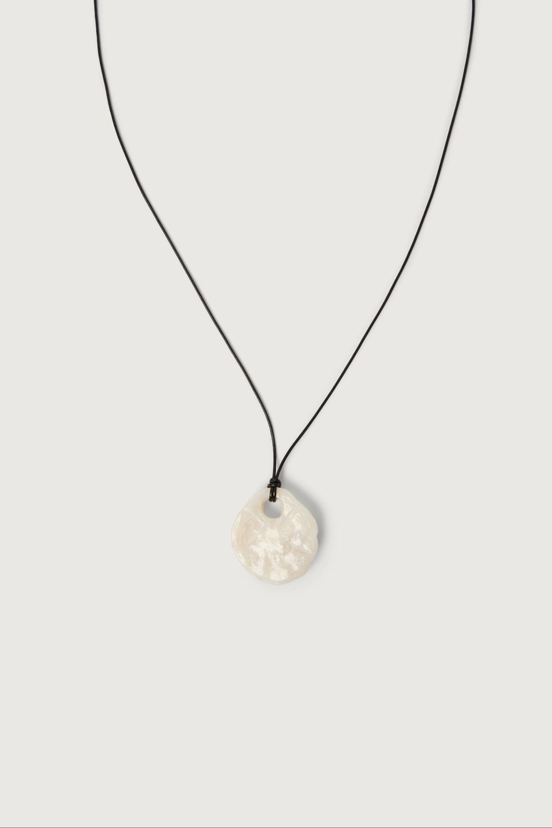 This necklace features an organic-shaped stone suspended from a corded chain. A minimal statement piece designed for effortless layering or standalone wear.