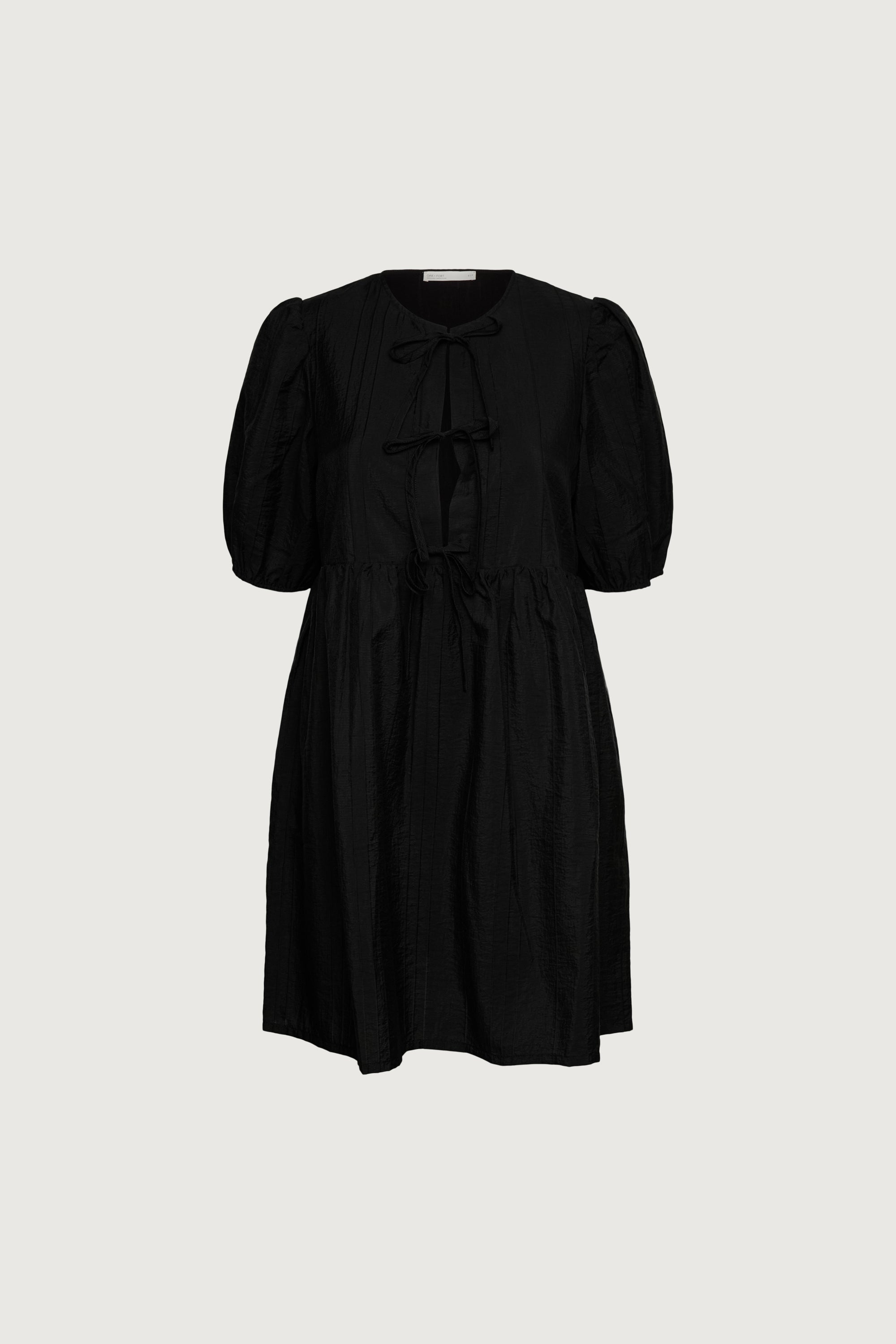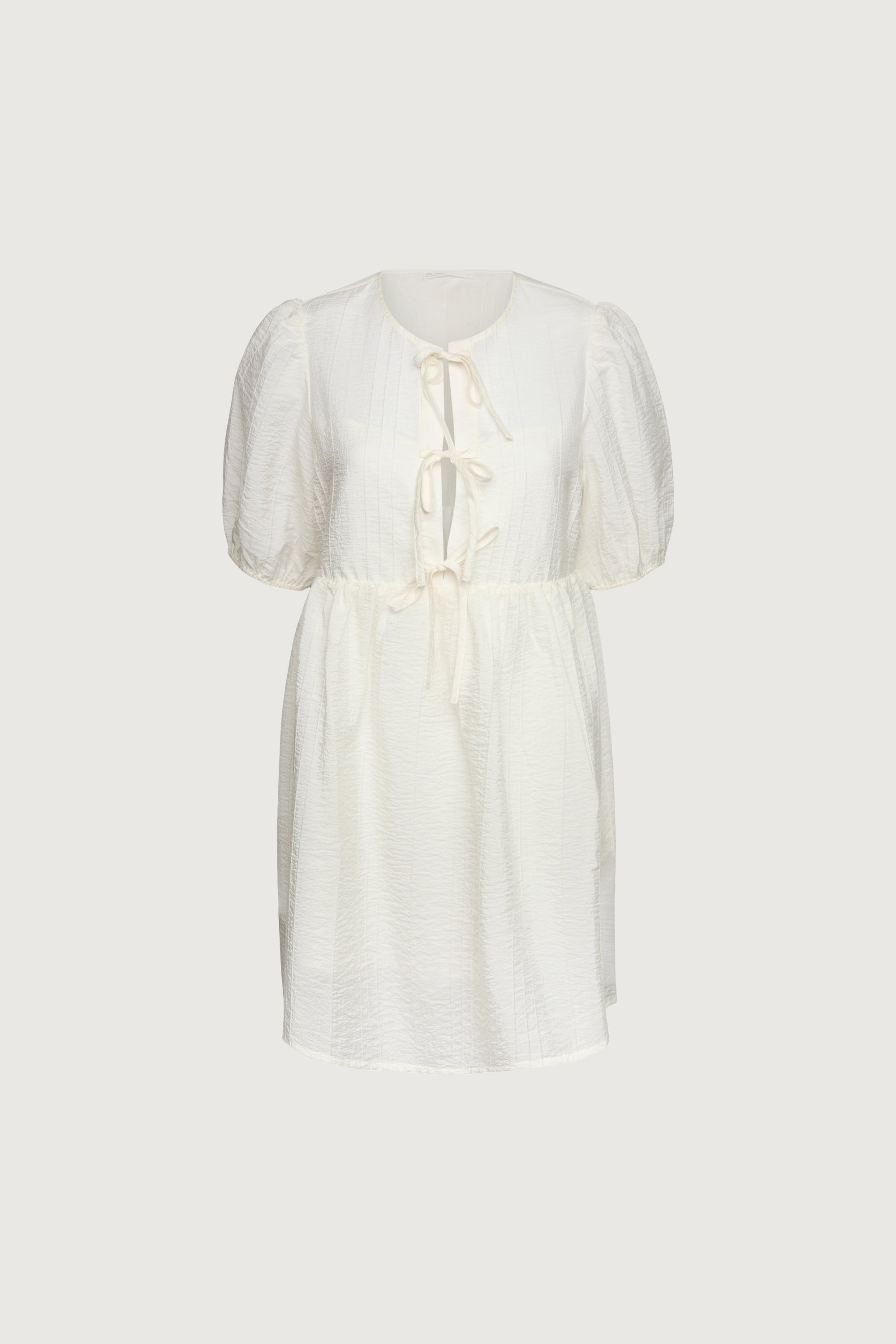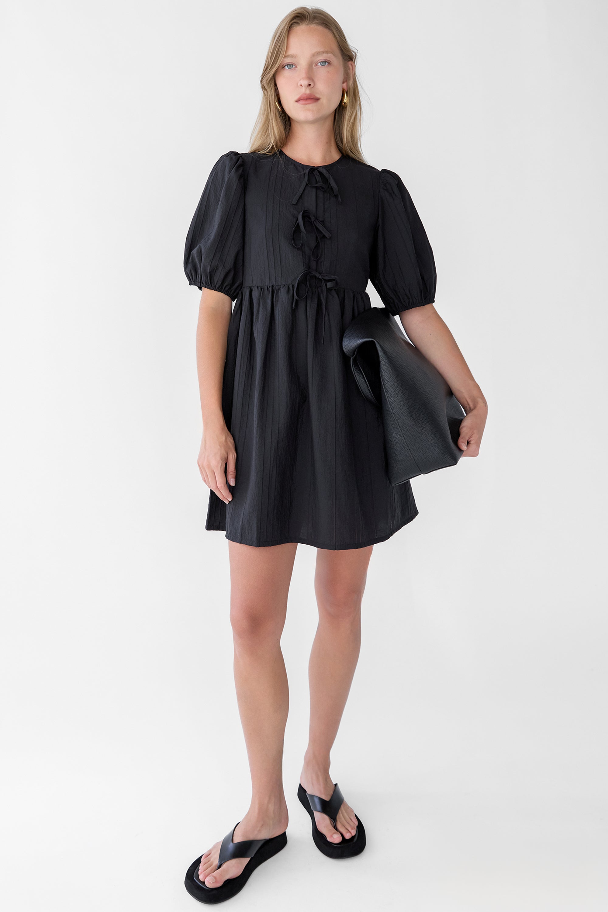 These breezy babydoll dress is lightweight, breathable and is made in a classic fit. Featuring a subtle puff sleeve design, a gathered waist, three front ties and is lined. Wear yours this season with ballet flats or biker boots.