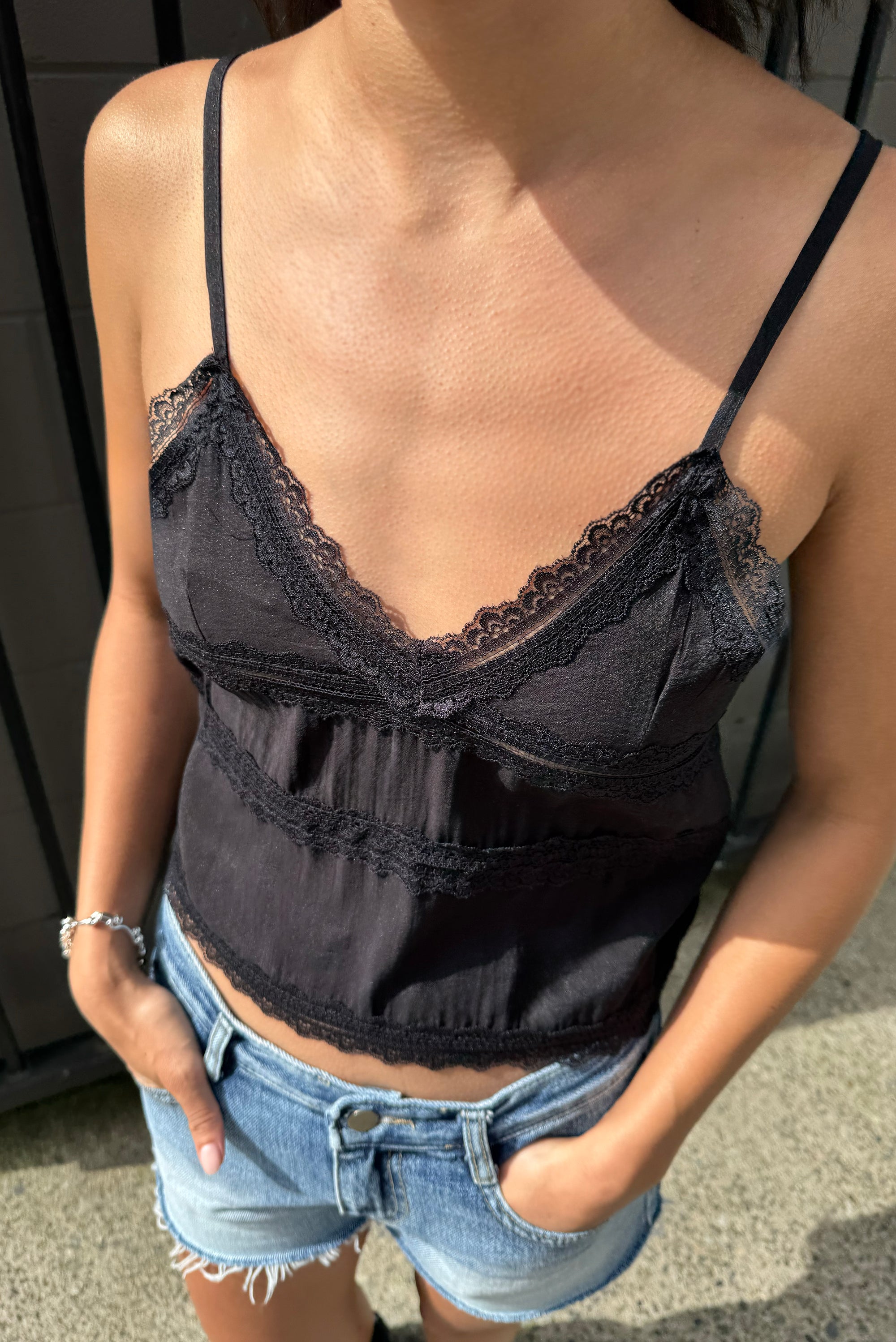 This cami top is the perfect foundation piece to any outfit. The top is designed with lightweight, breathable fabric, and constructed in tiers. Lace lines the trim, and tier seams. The top is cropped with a V neckline.
