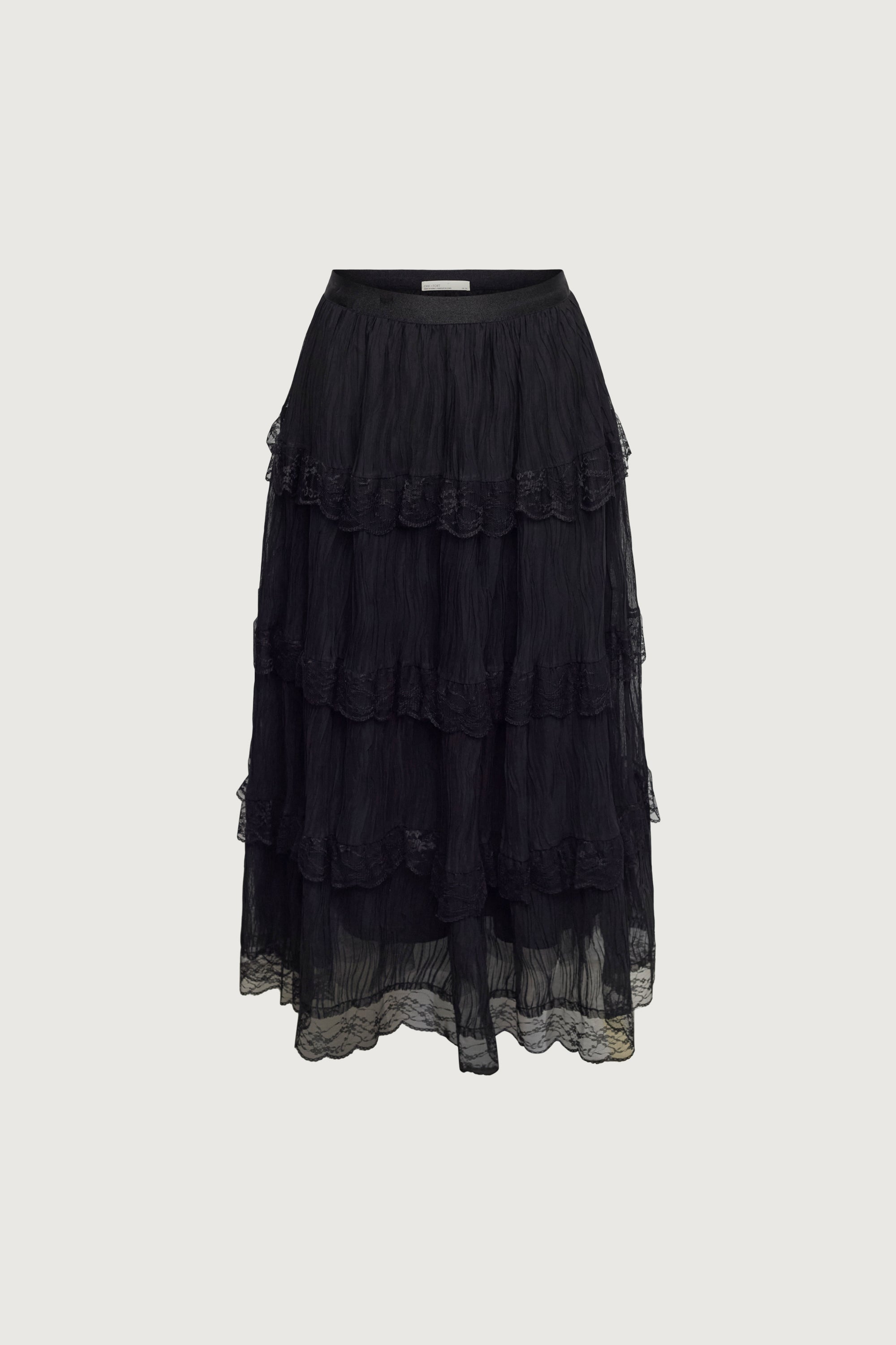 This maxi skirt can be worn casually or dressed up. The versatility makes it a great addition to any wardrobe. The skirt is constructed in tiers with a lightweight, stretchy mesh fabric. The skirt also features lace lining the trims, and gathered seams at its stretch waistband. The fabric is fluted throughout providing texture, and a soft internal layer for comfort.
