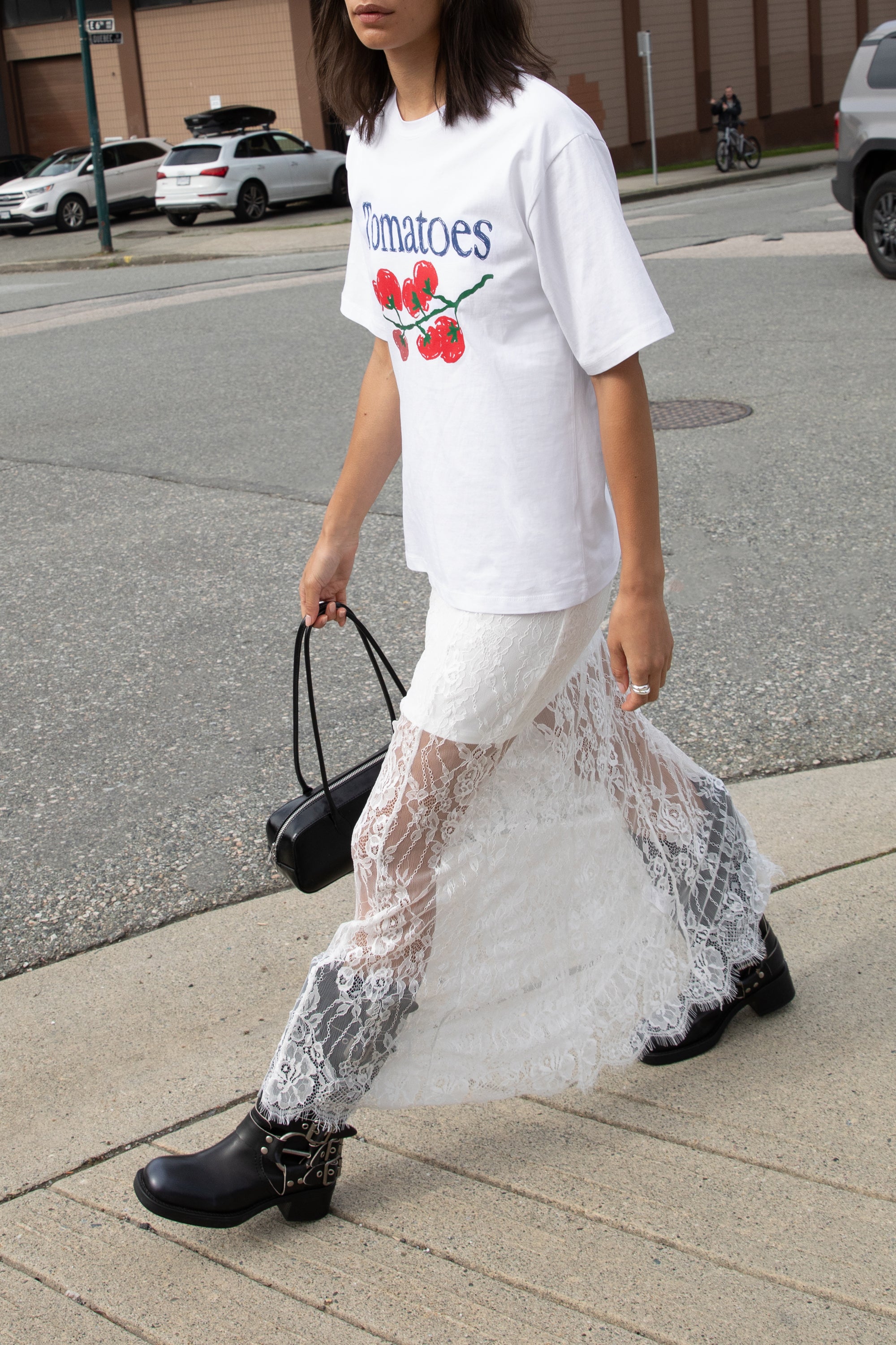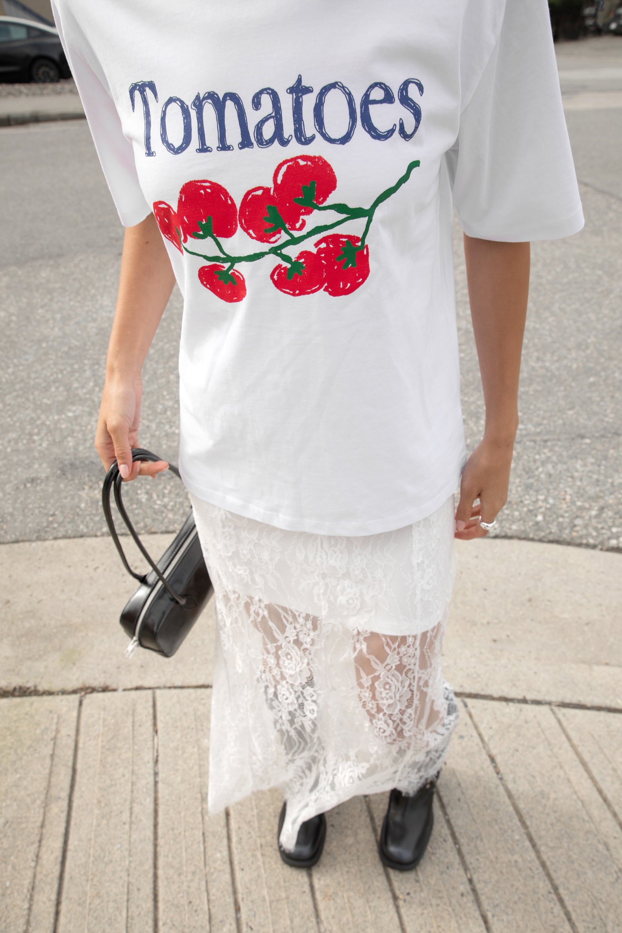 A classic short sleeve T-shirt that features a screen printed tomato graphic. A fun addition to any wardrobe.