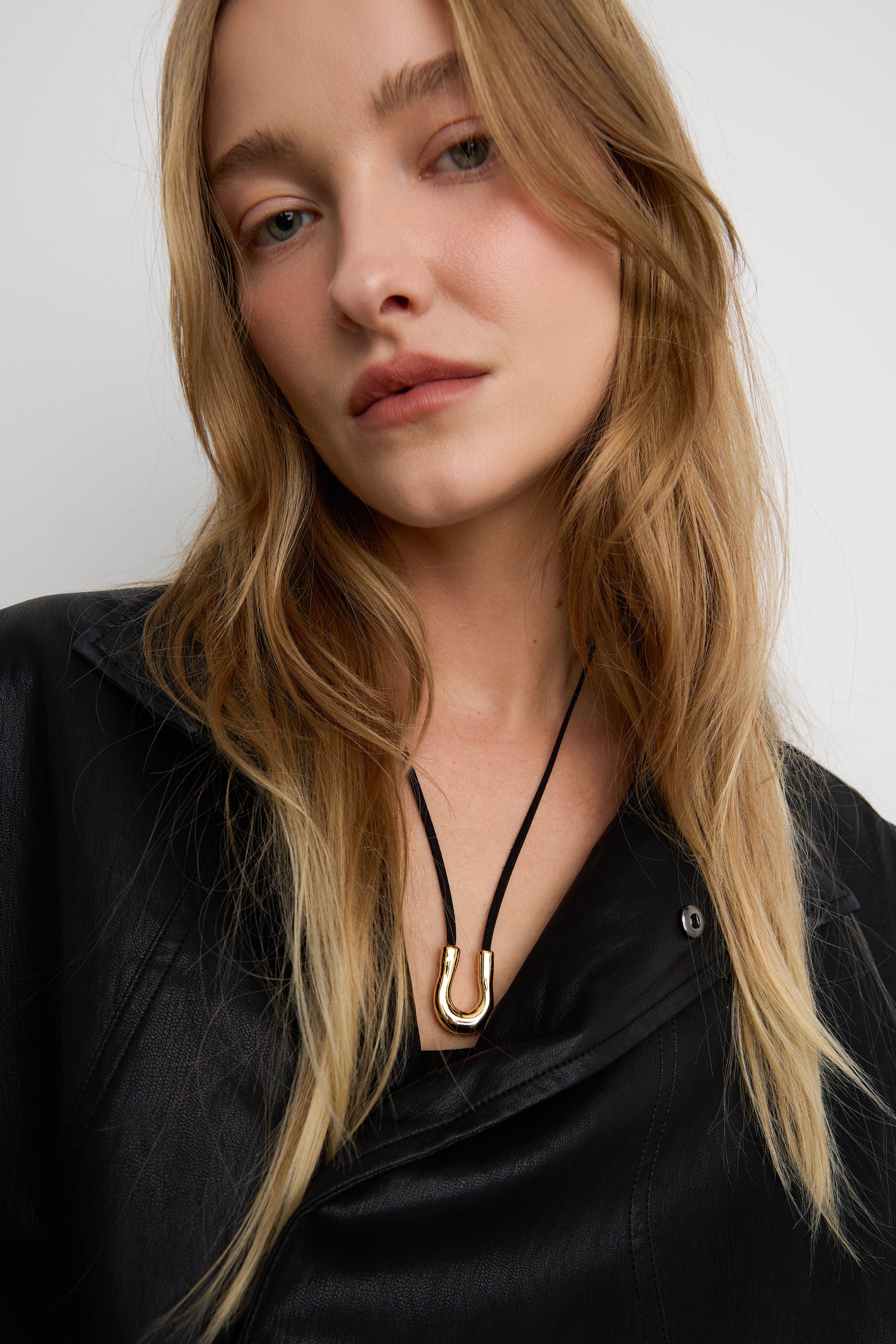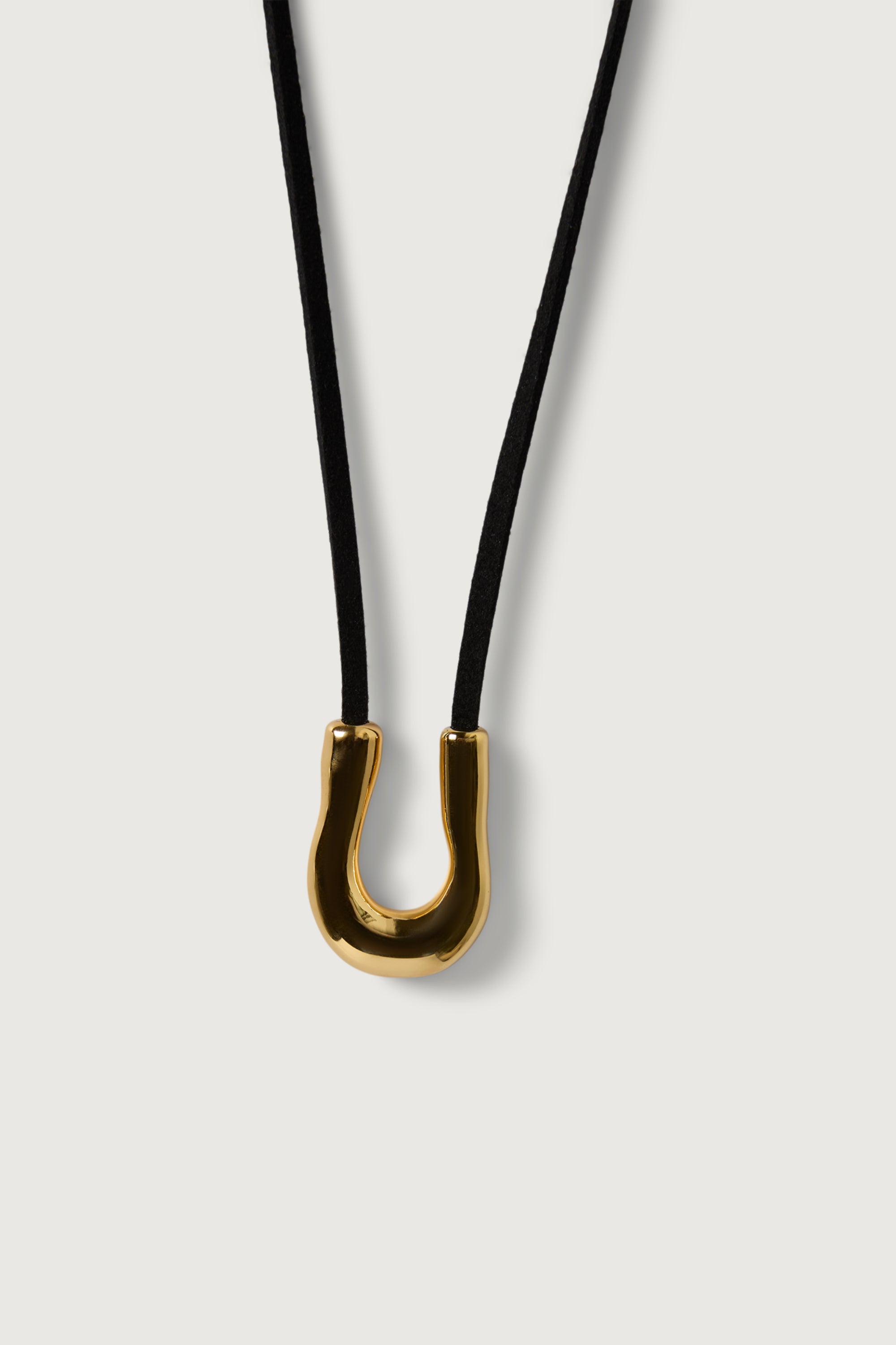 This necklace features a cord chain with a horseshoe U shaped pendant. You can achieve the perfect length with the adjustable slip bead for easy sizing. Wear alone on layered with your favourite necklaces.