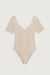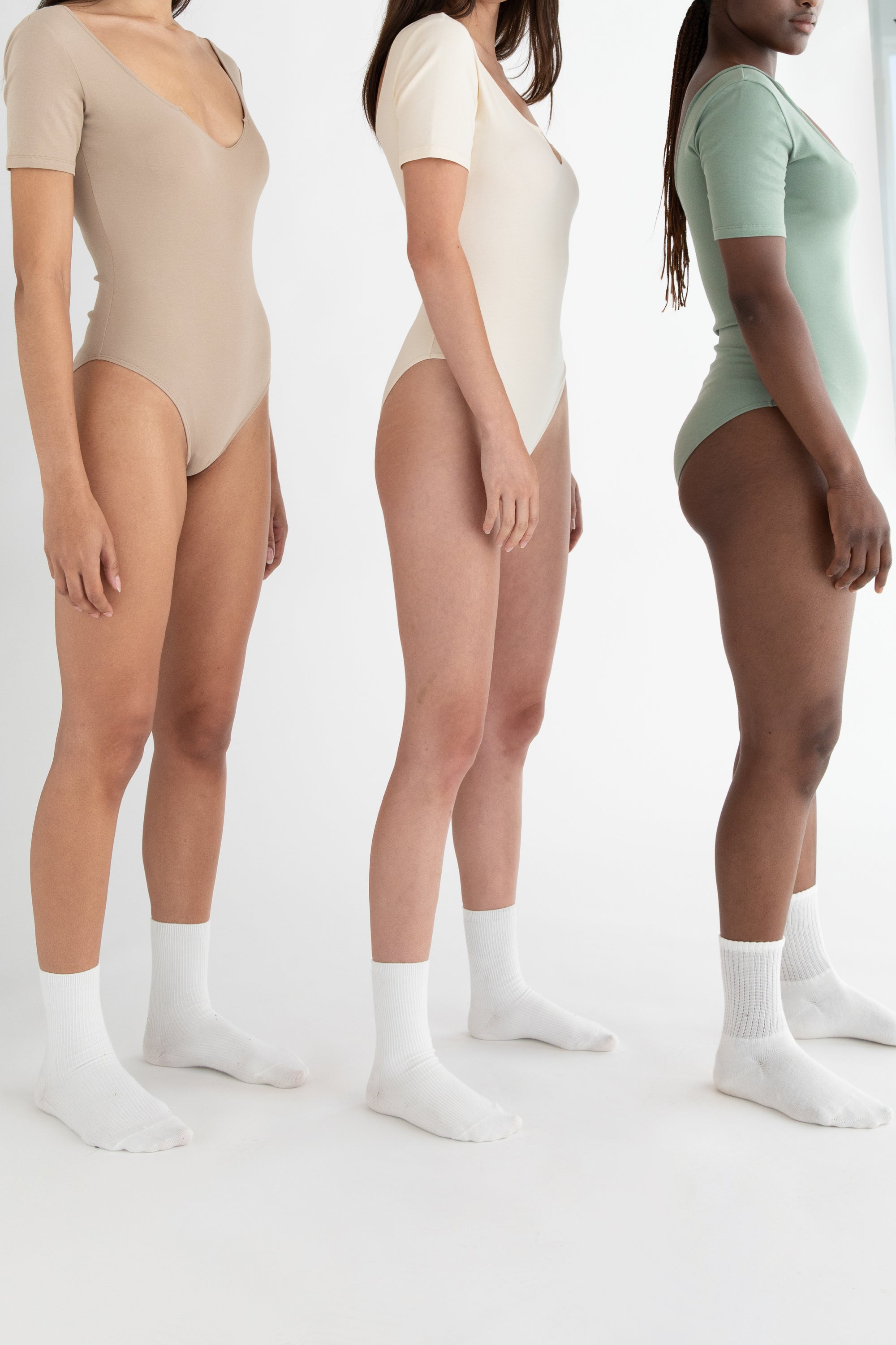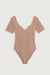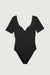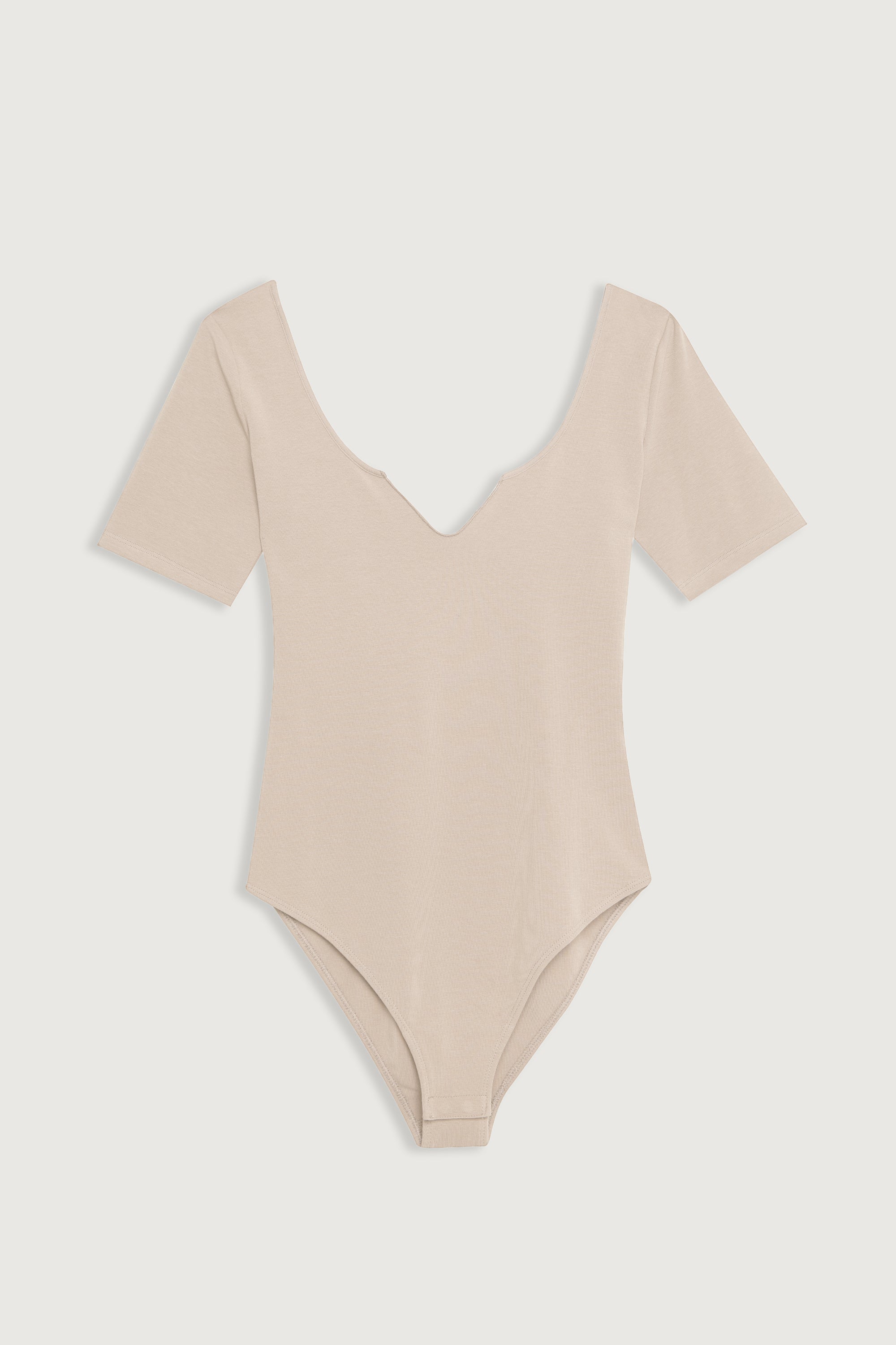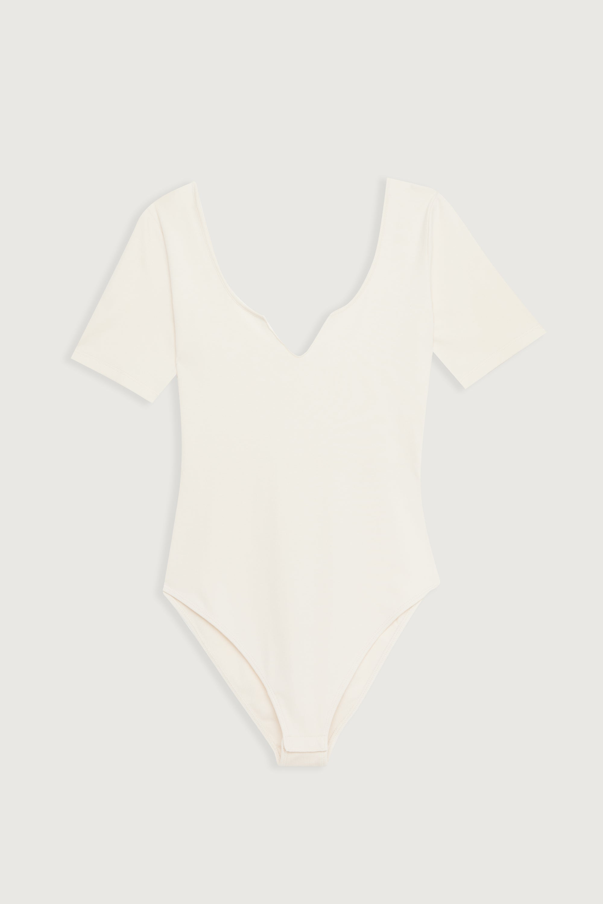 - Fitted with stretch. Short sleeves. V-neck detail.
