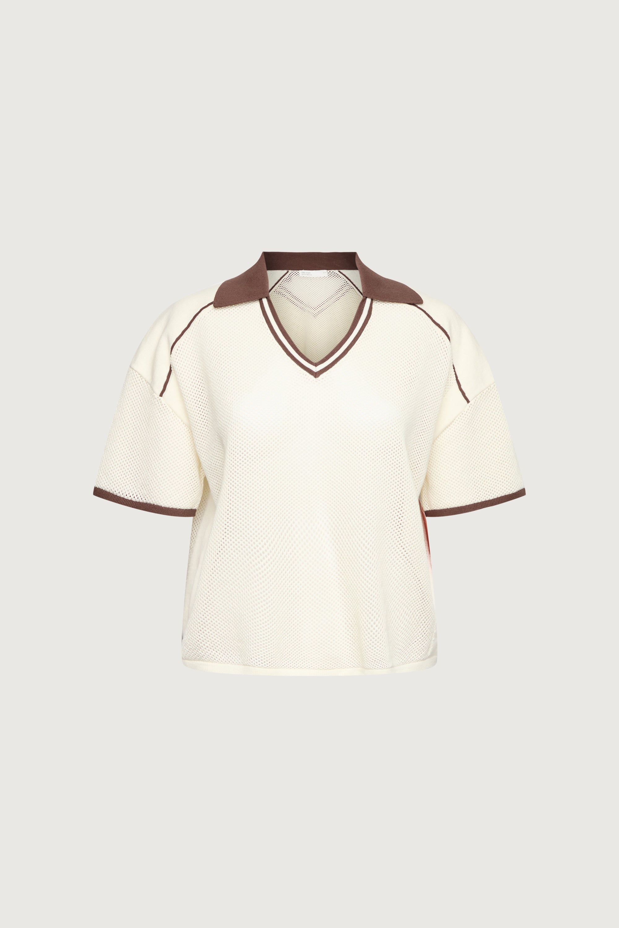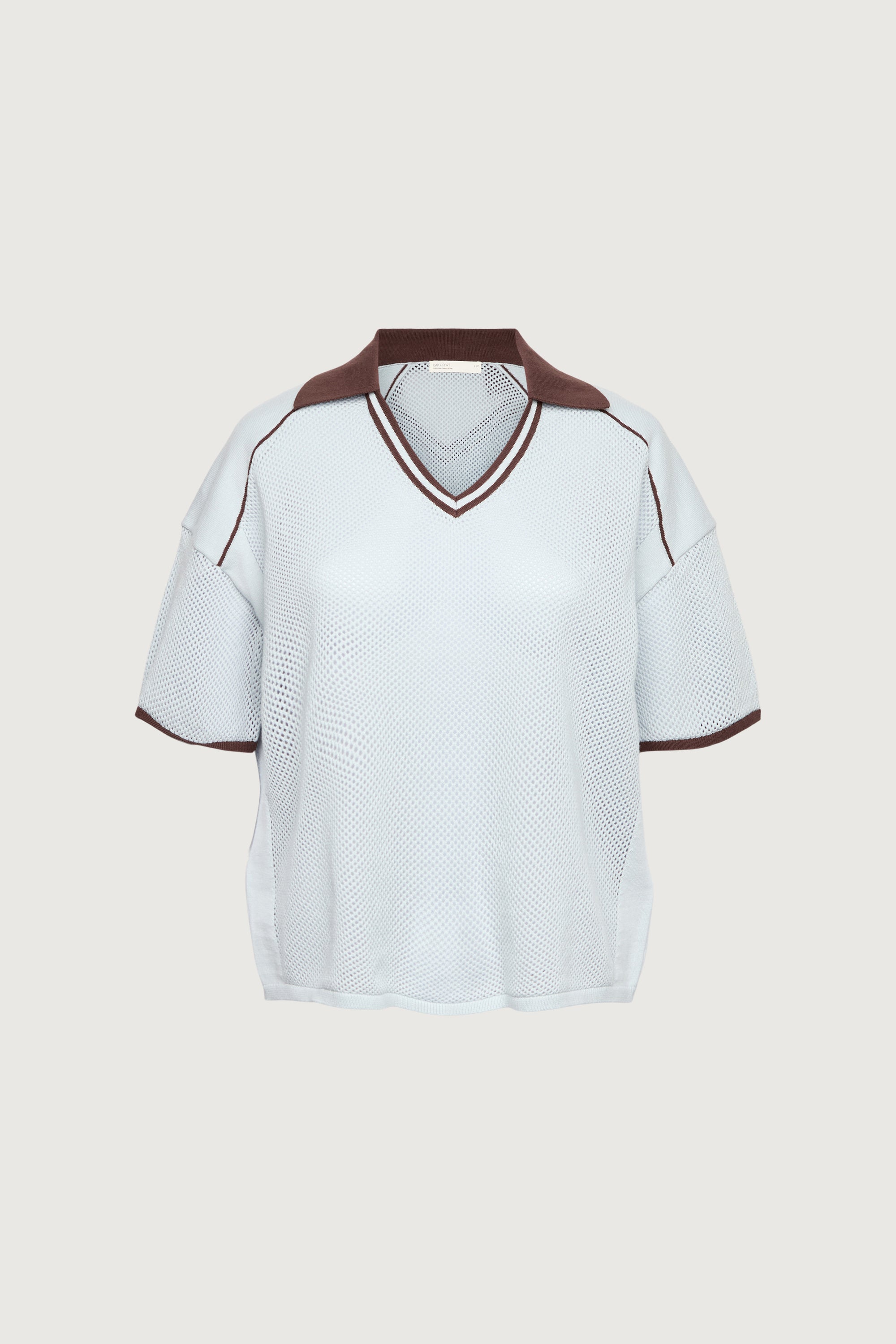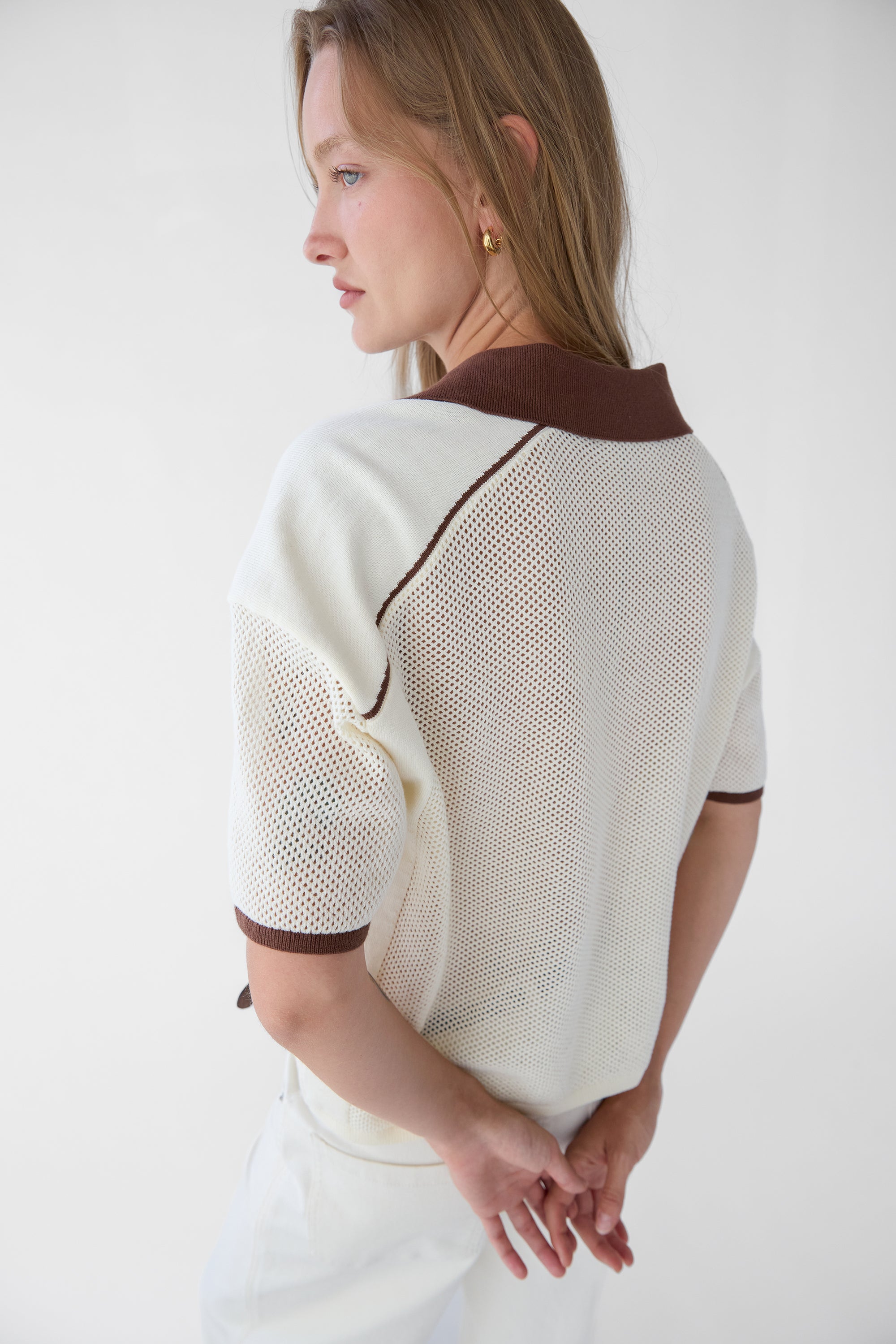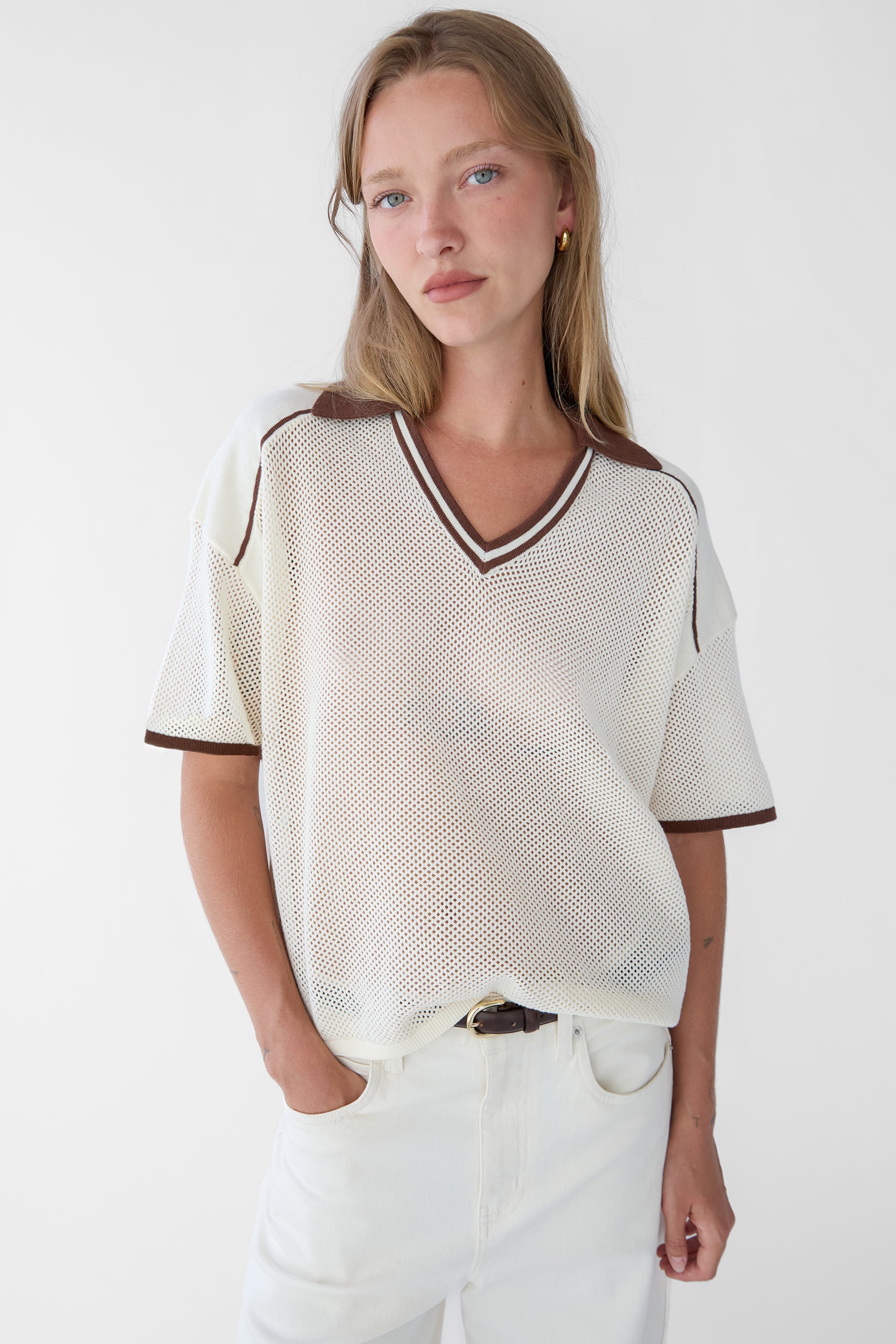 This mesh knit crochet polo is made in an oversized fit and has varsity inspired details. Pair yours with white jeans or a mini skirt.