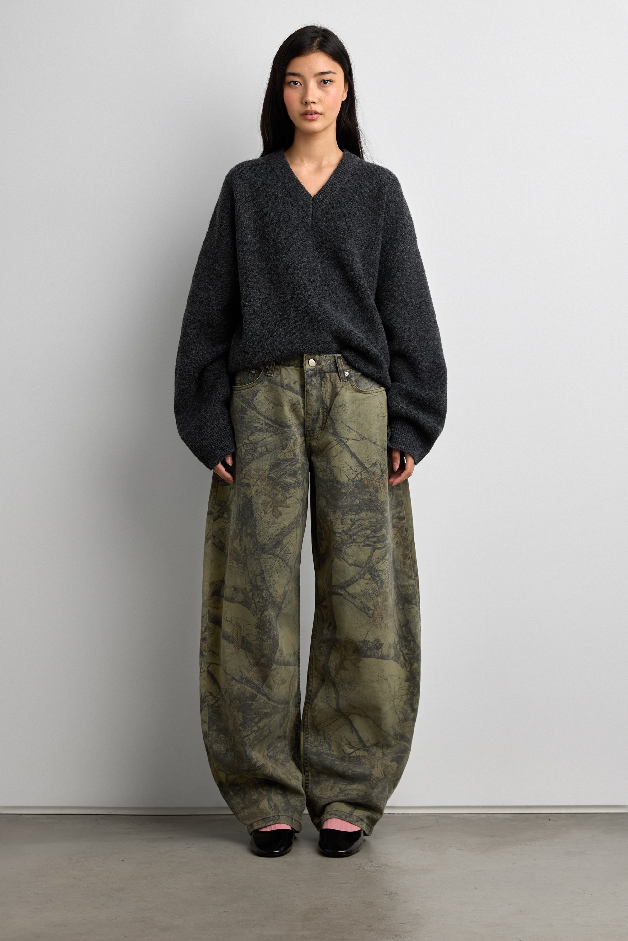 V-neckline. Ribbed trims. Dropped shoulders.