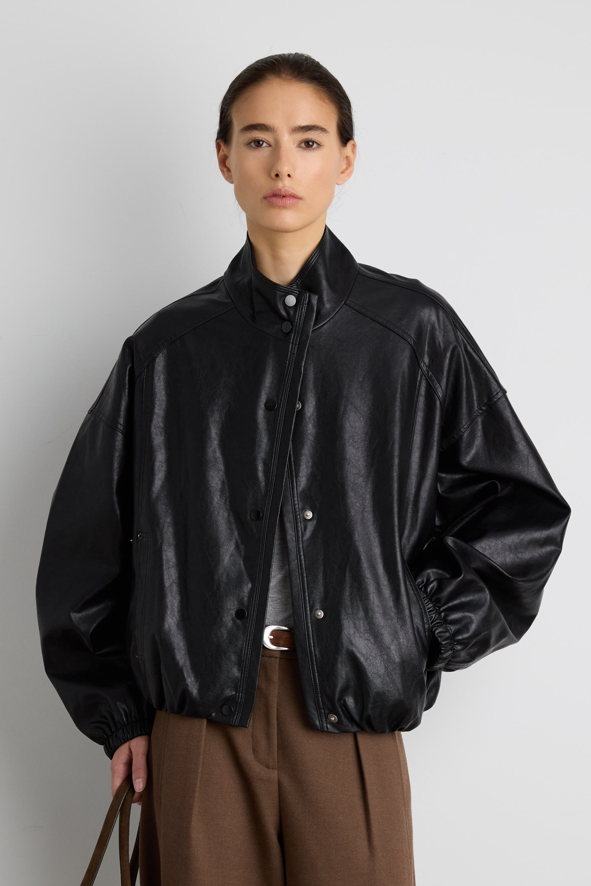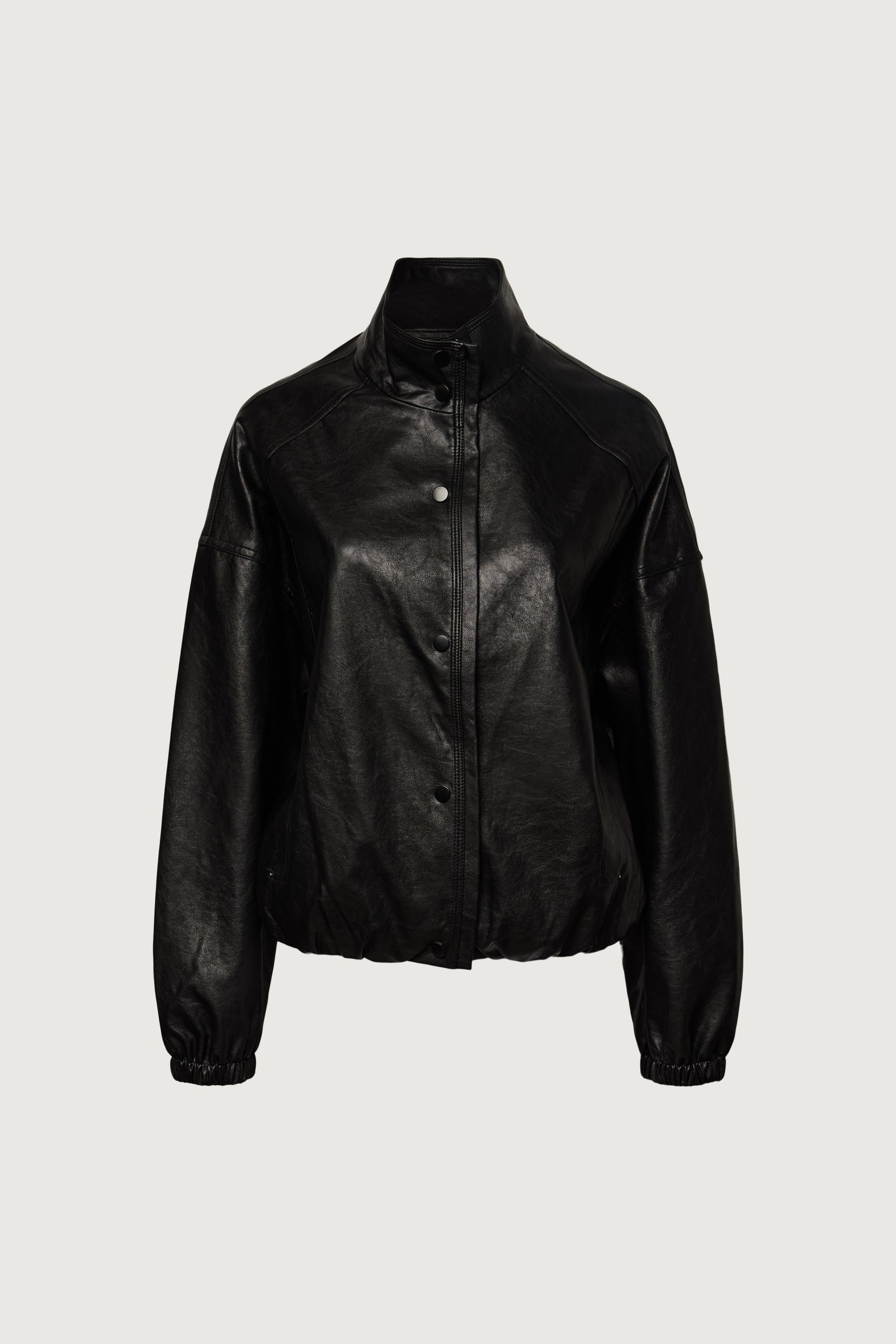 Vegan leather. Funnel neck. Snap buttons. Side pockets. Elasticated hem and cuffs. Lined.