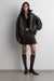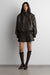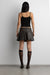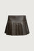 This vegan leather mini skort is made in a deep brown colour with lightly distressed seams and has a pleated hem. An easy fall staple to wear with any top, wear it with the matching vegan leather bomber jacket or with a cozy knit.