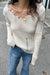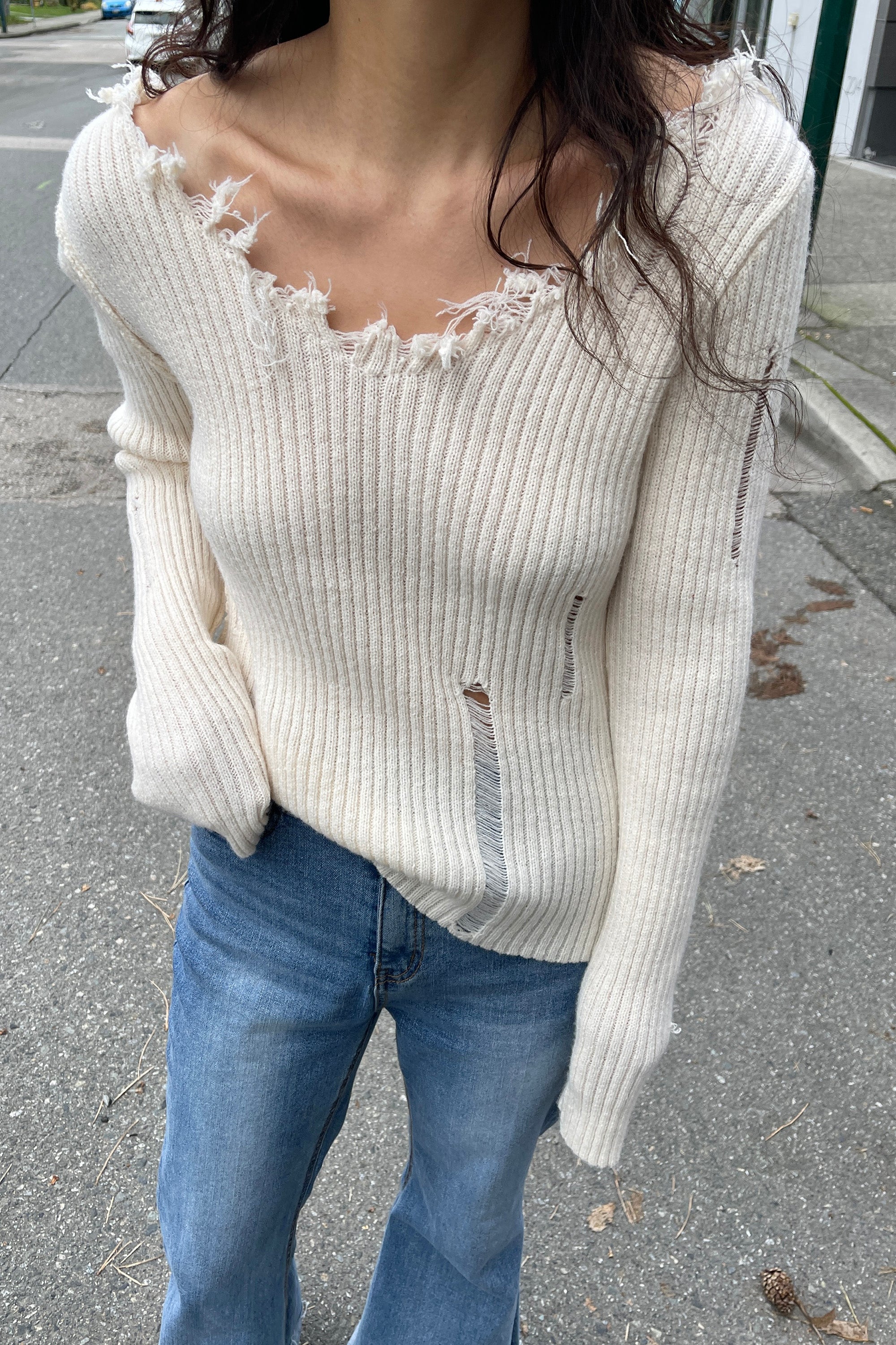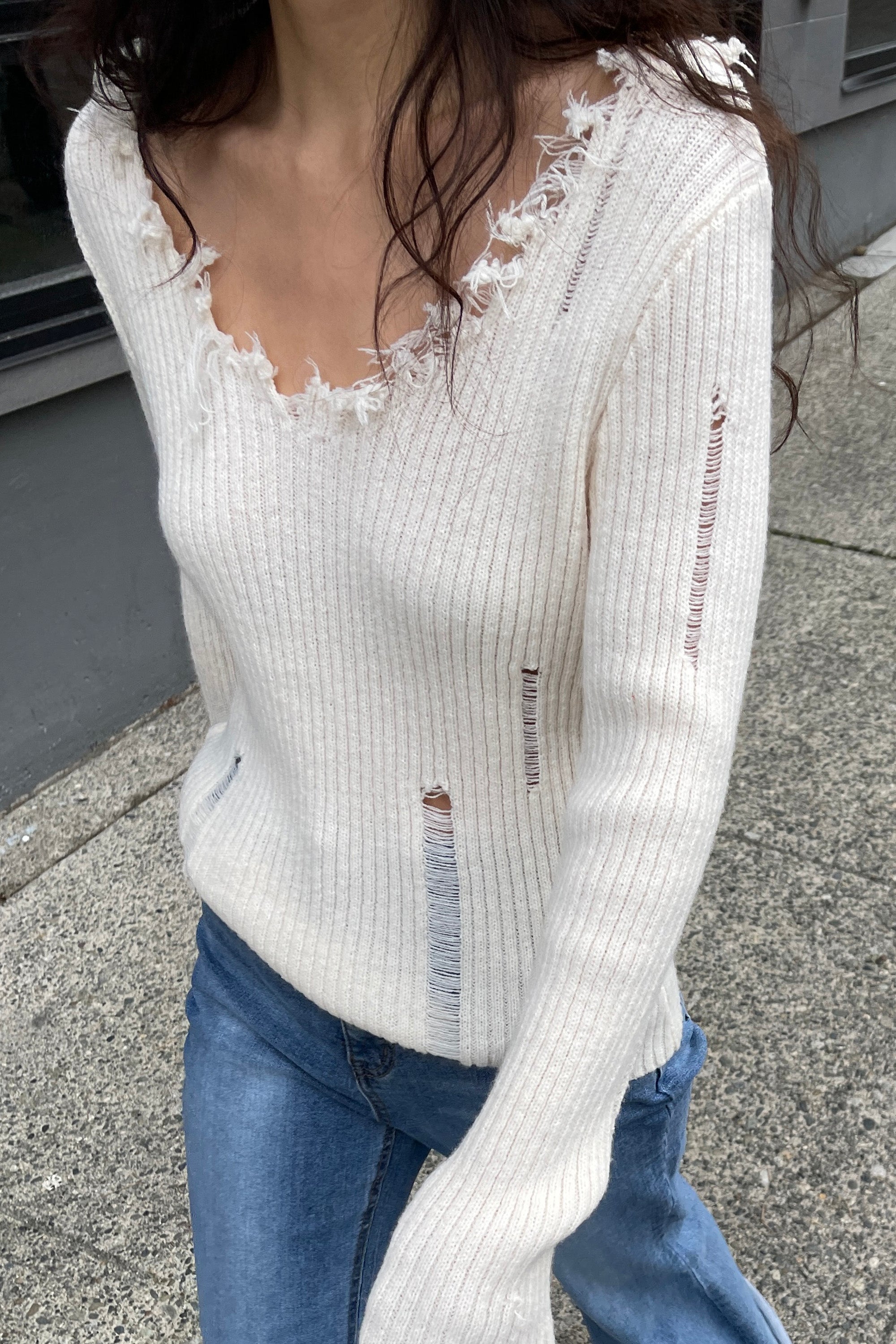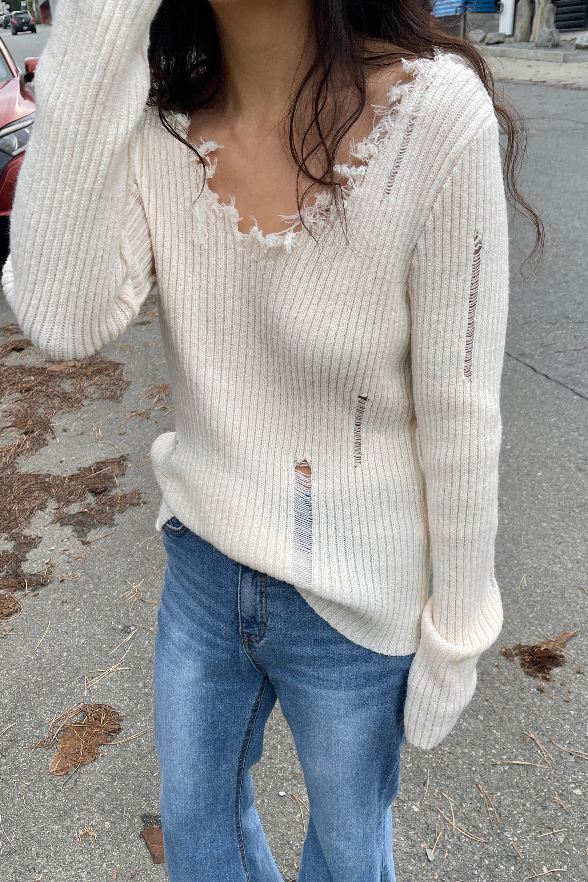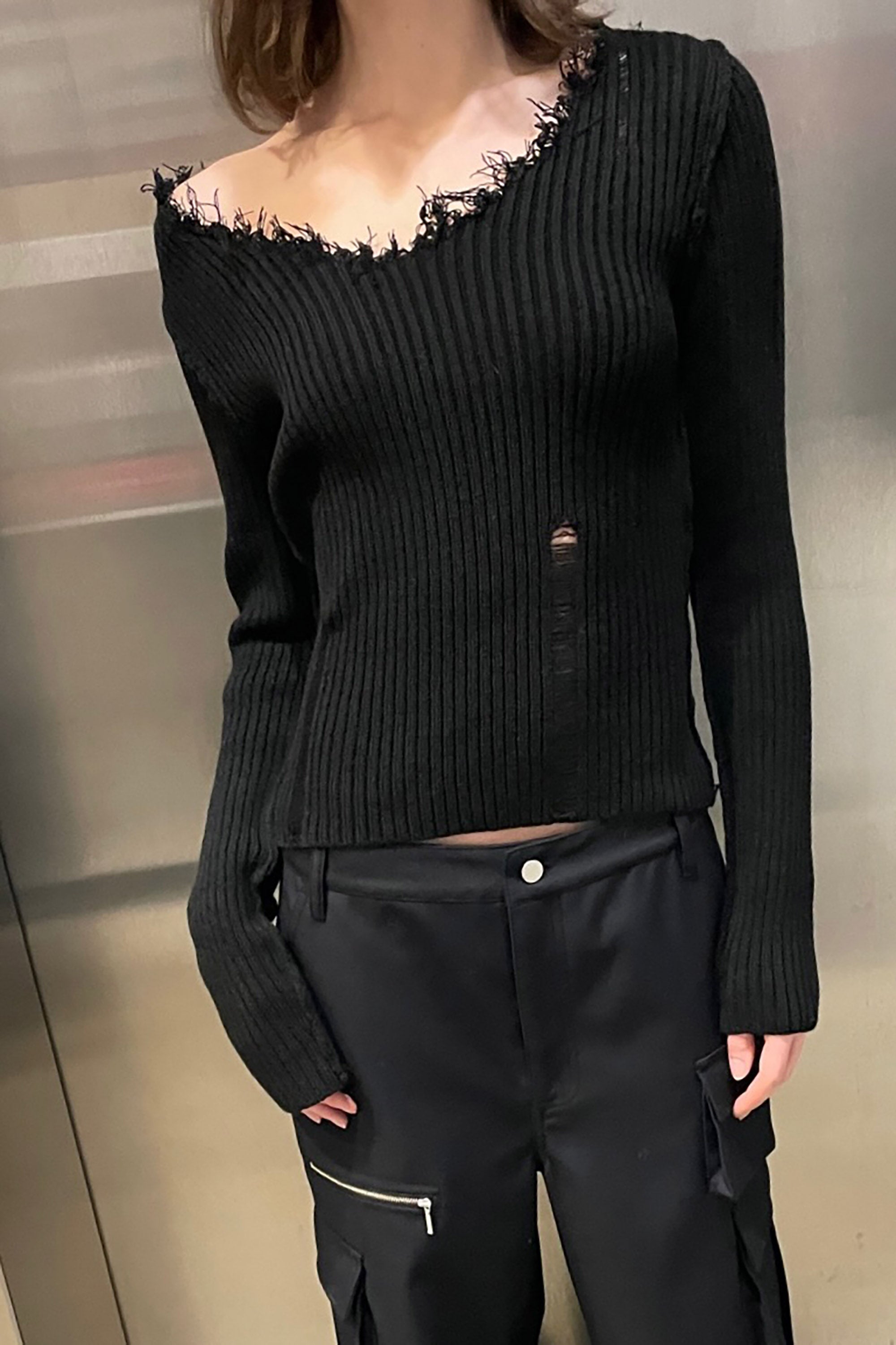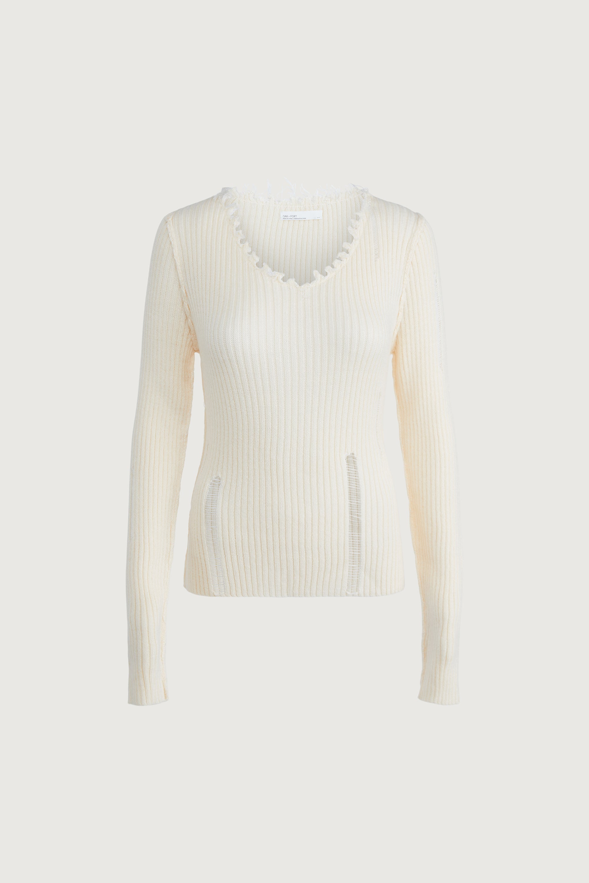 Classic fit. Rib-knit. Frayed V-neckline. Distressed details.