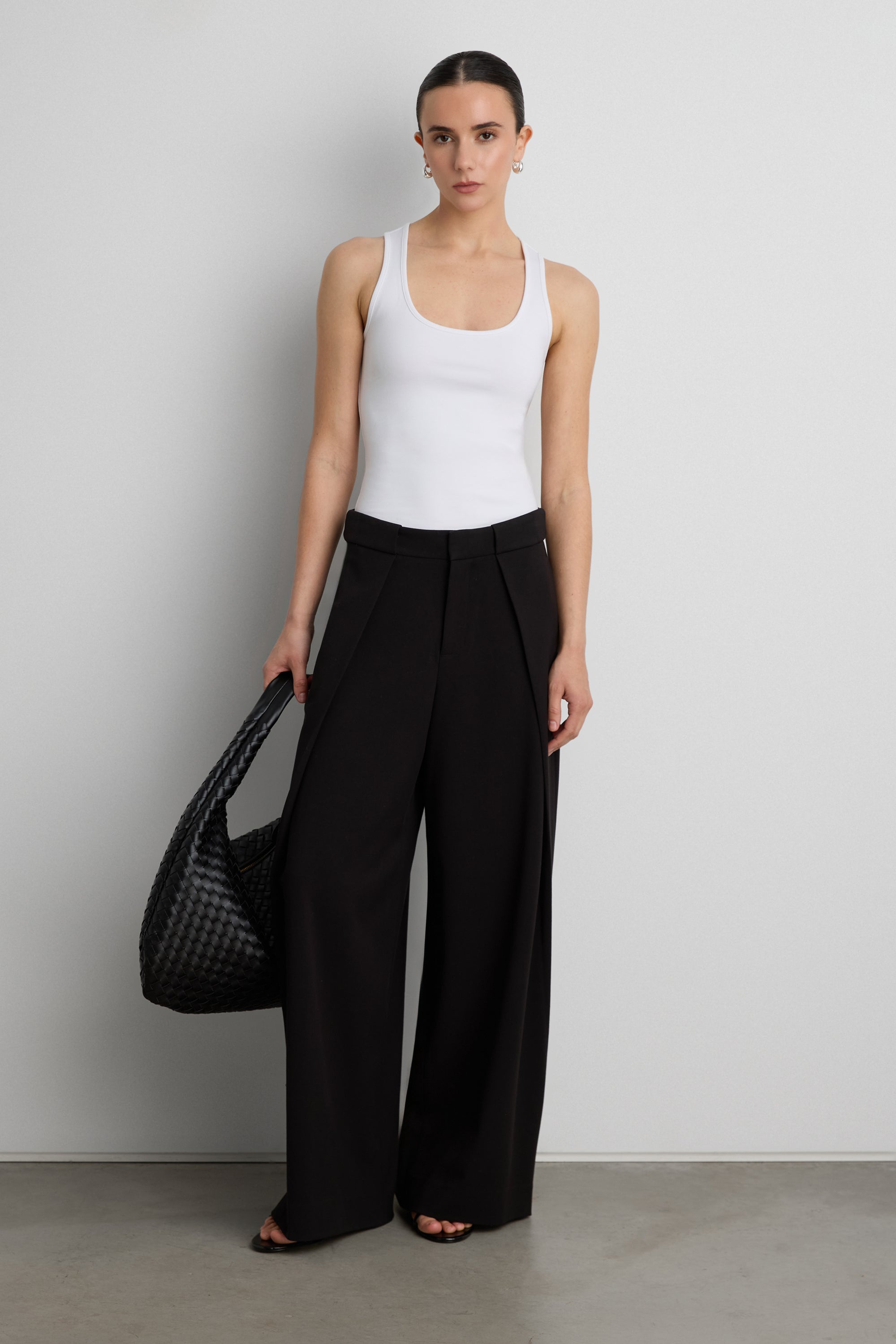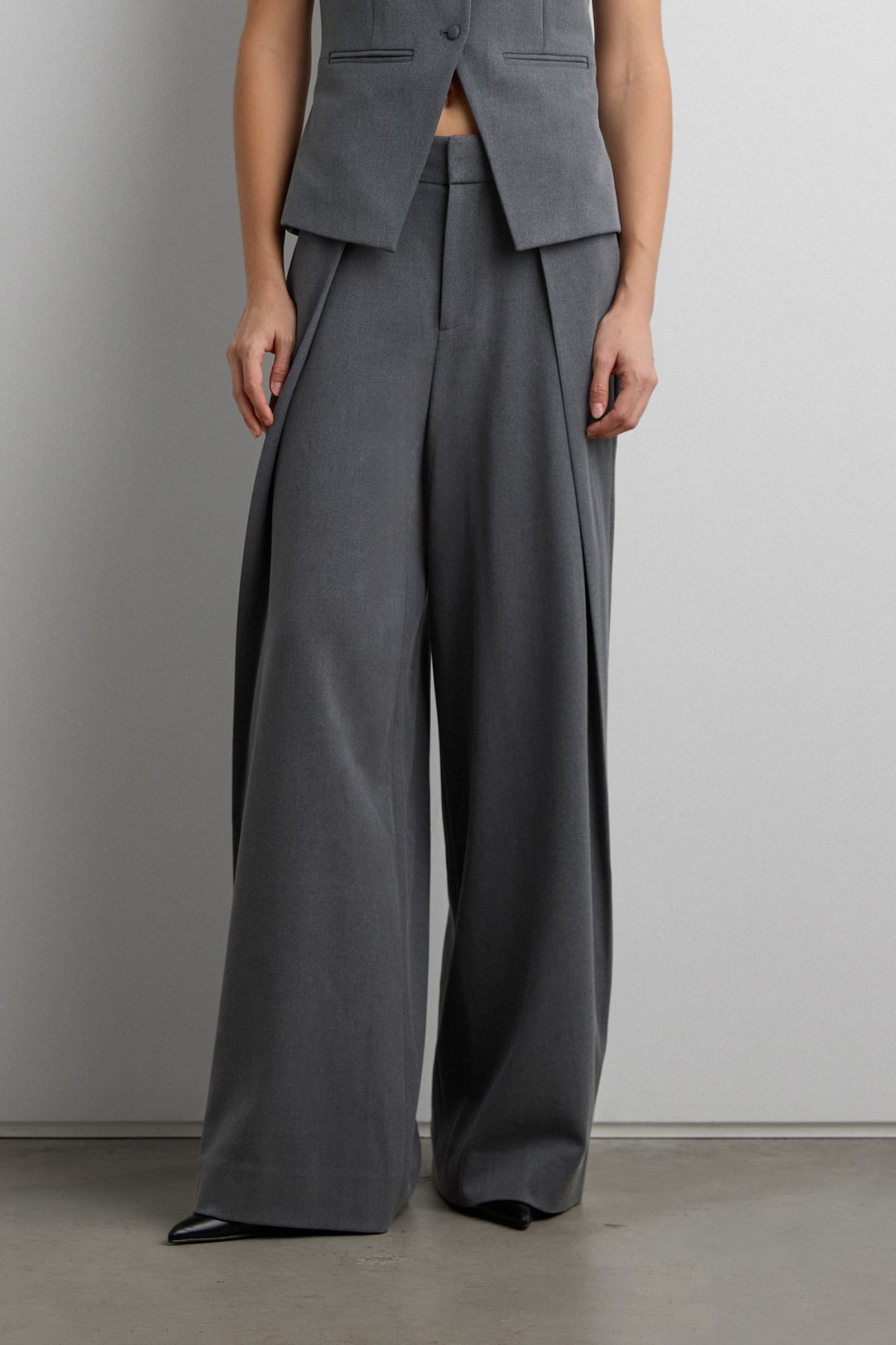 These wide leg trousers are made in a relaxed fit with a high-rise waist. It's detailed with a belt loop, side pockets and a folded pleat design at the hips. It has the perfect amount of stretch to stay comfortable all day long.