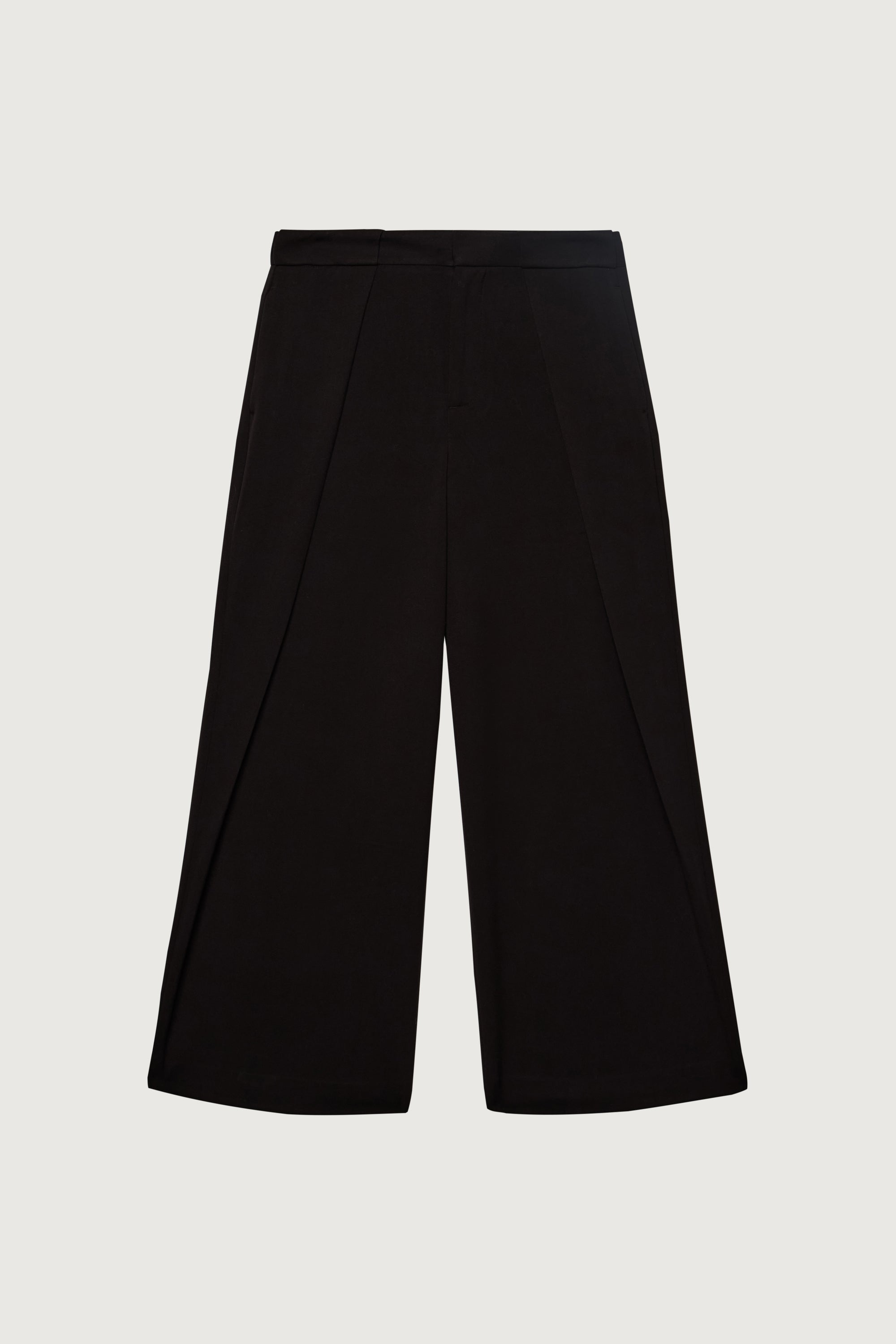Smooth suiting fabric. Belt loop. Front folded pleat. High-rise waist. Side pockets. Back welt pocket design. Full zipper and hook and bar closure.