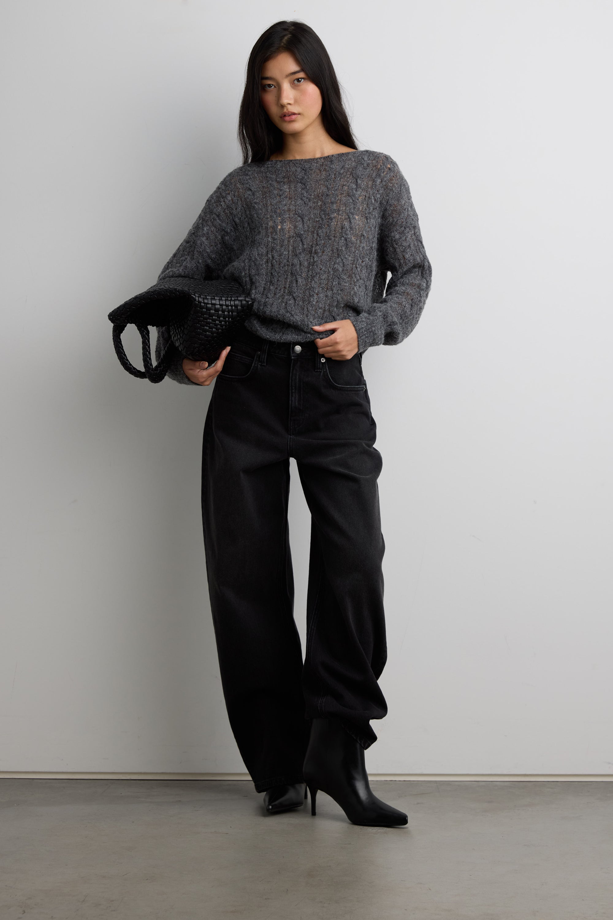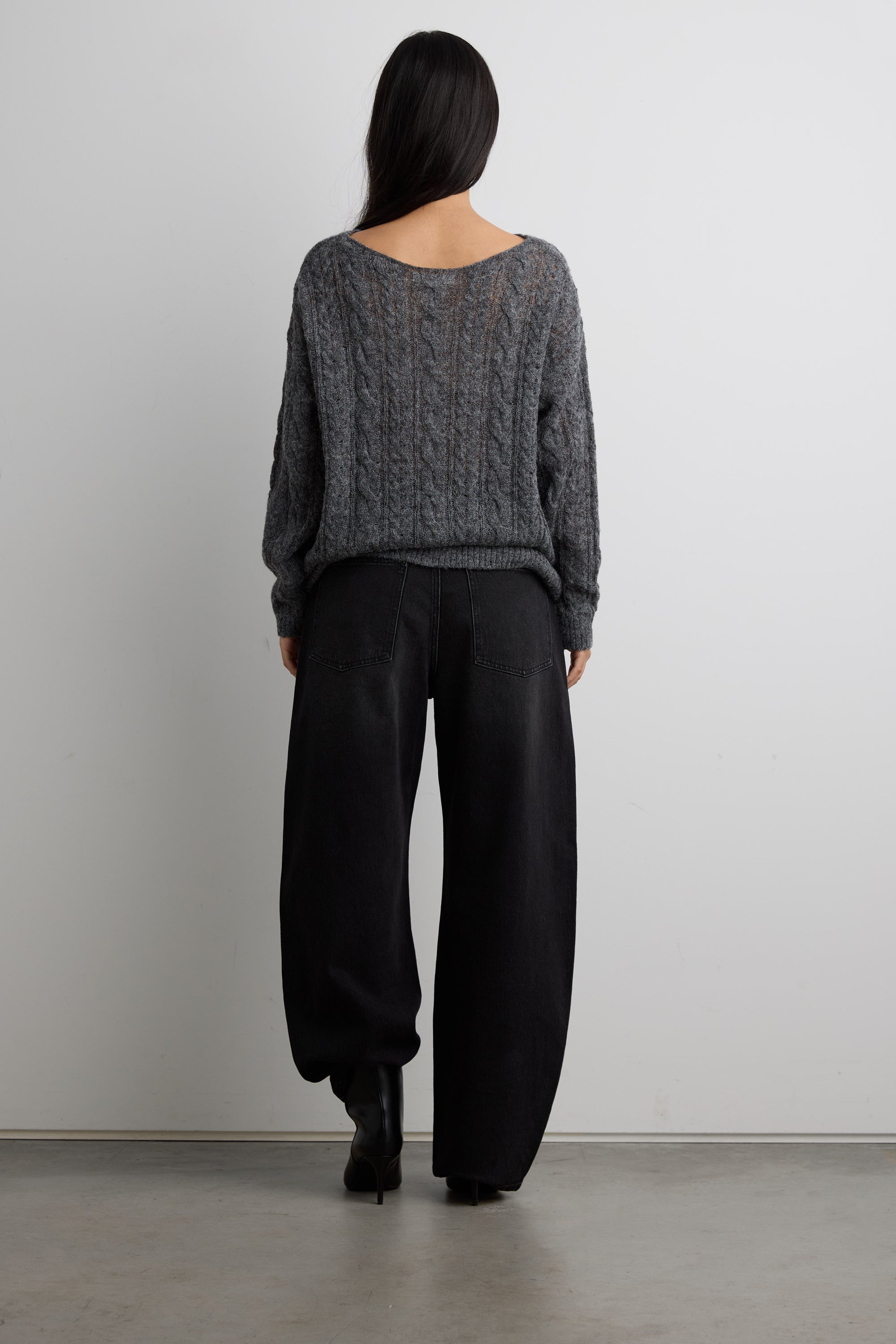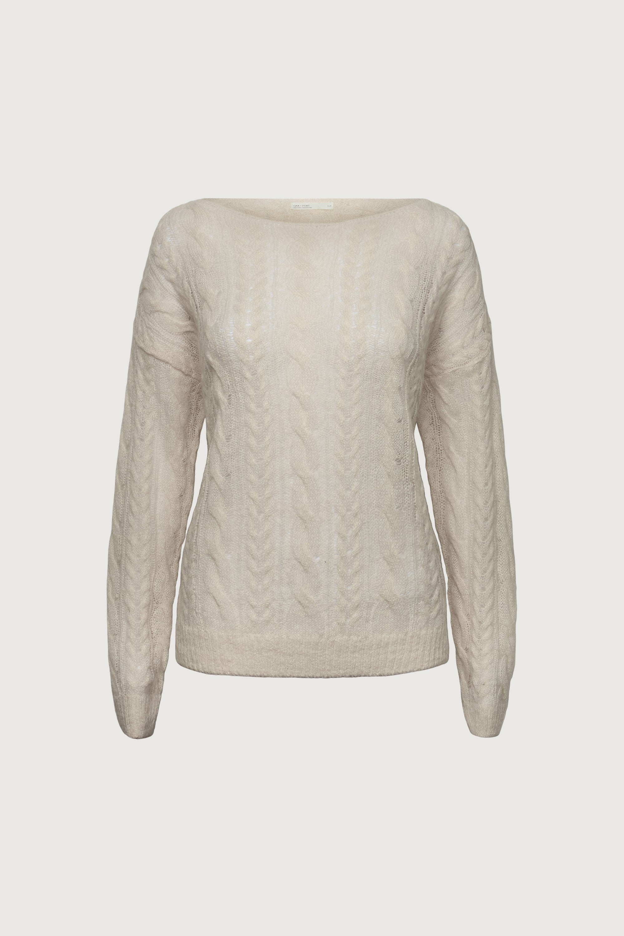 Wool blend cable knit. Wide neckline. Dropped shoulders. Ribbed trims.