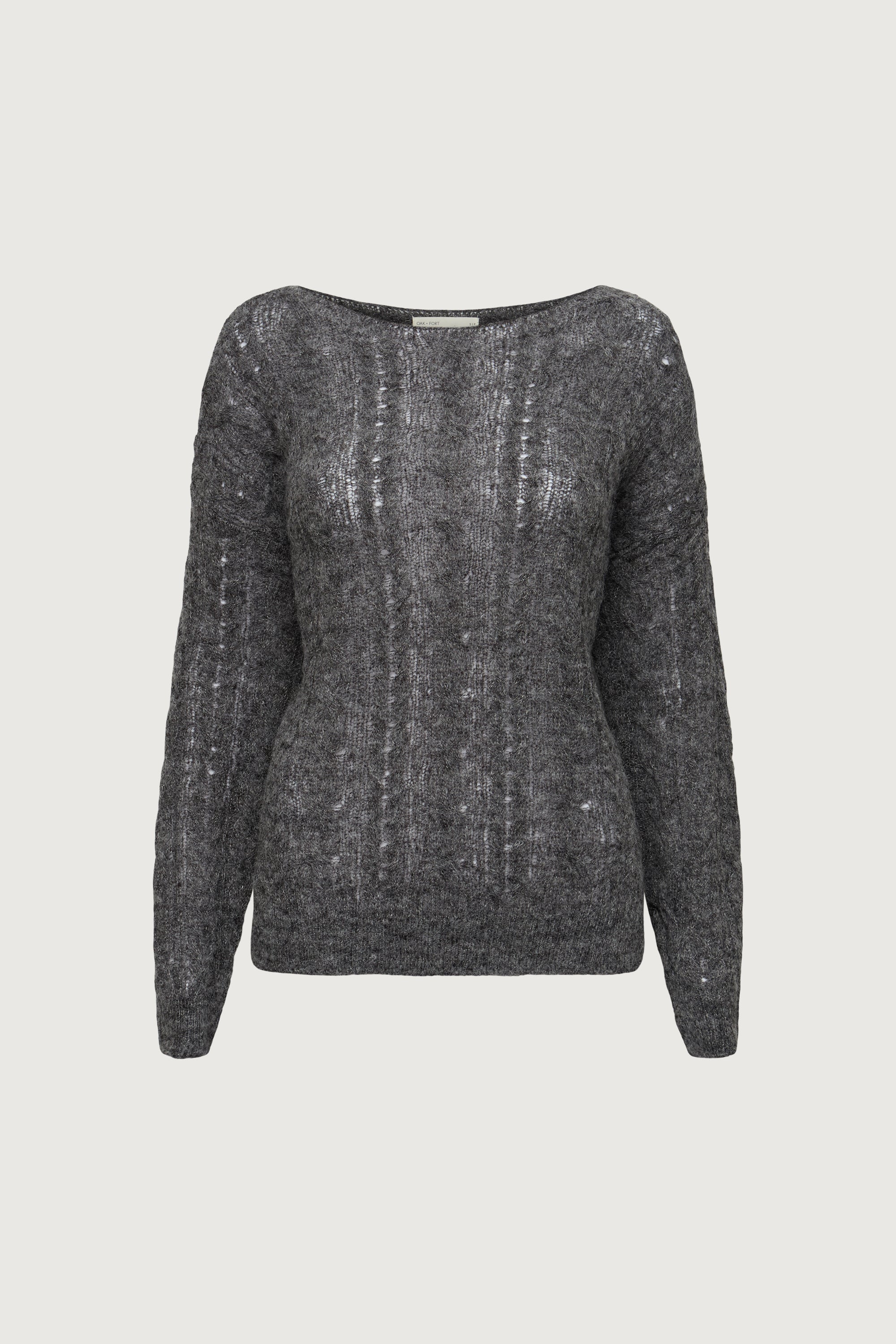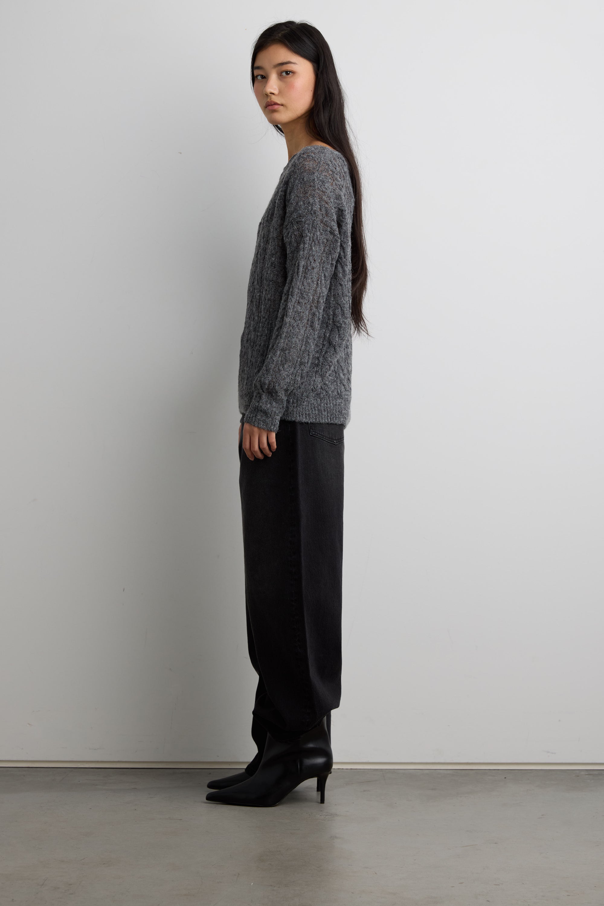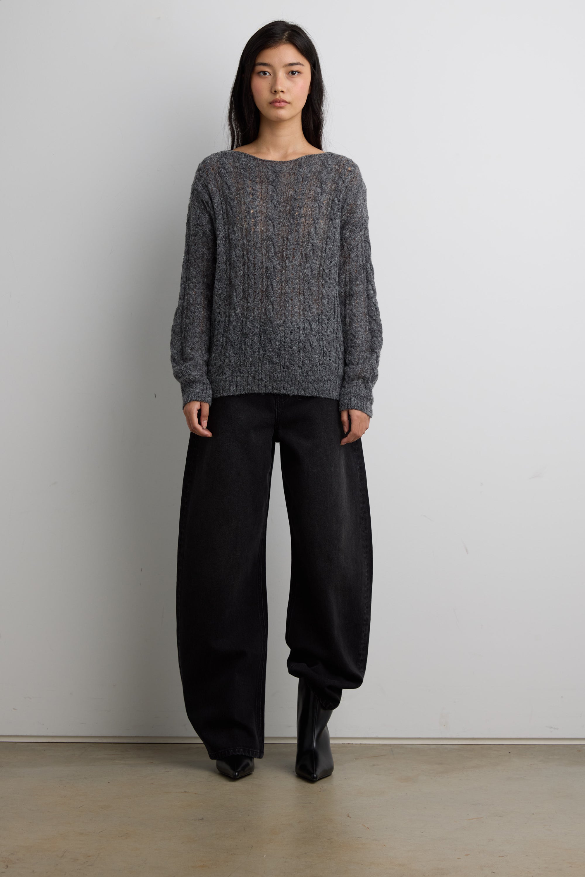 Wool blend cable knit. Wide neckline. Dropped shoulders. Ribbed trims.