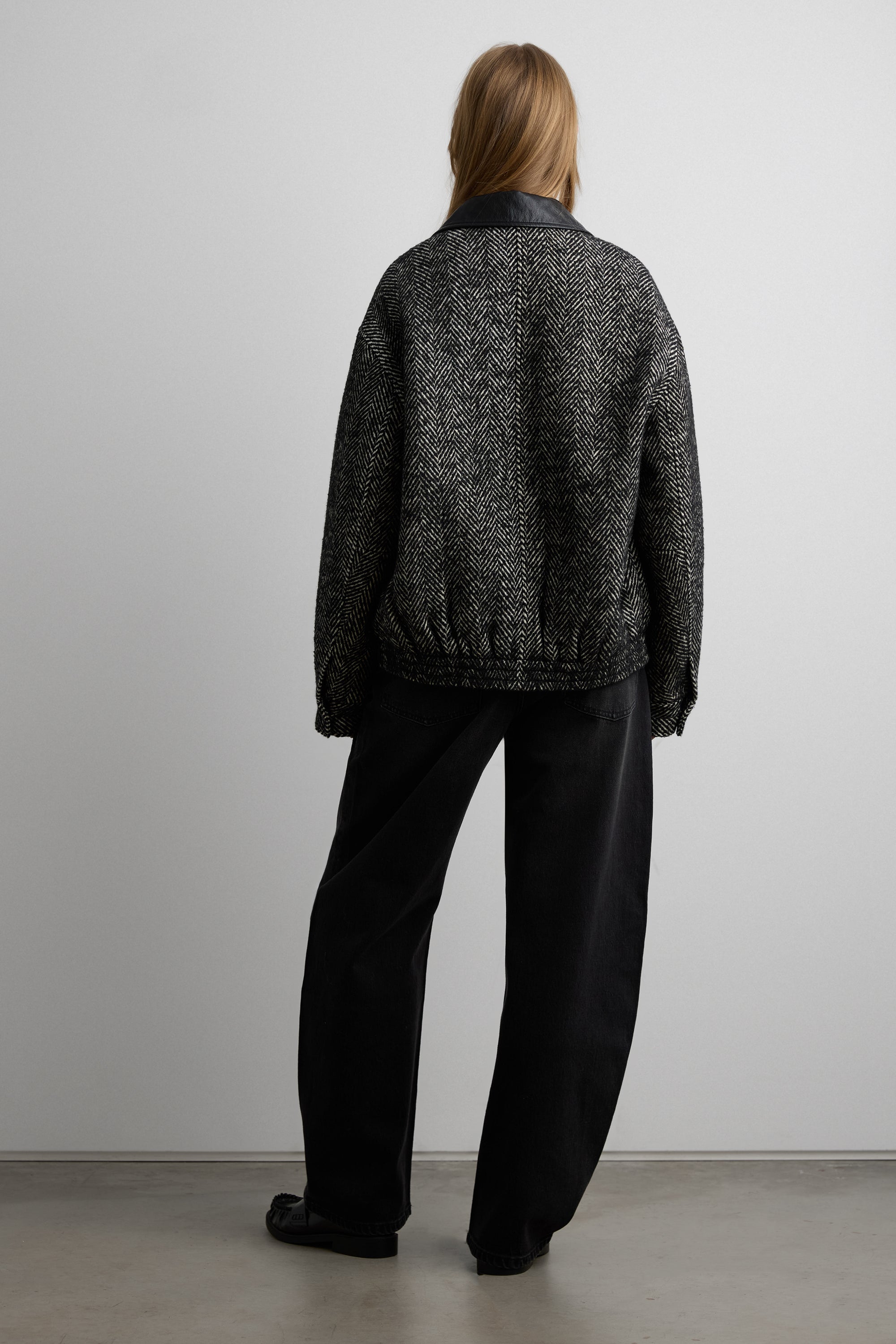 Wool-blend herringbone. Vegan leather collar. Quilted interior. Zipper front. Front patch pocket with snap buttons. Elasticated hem.
